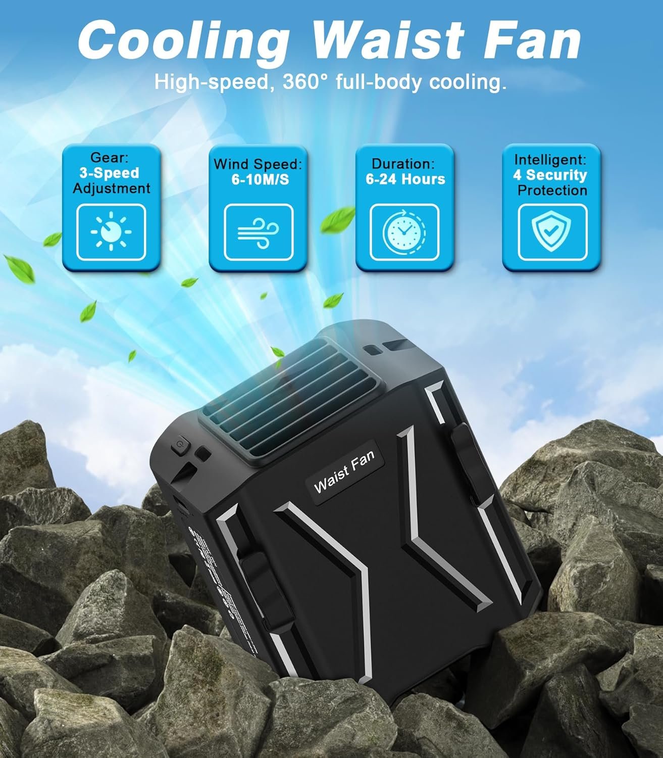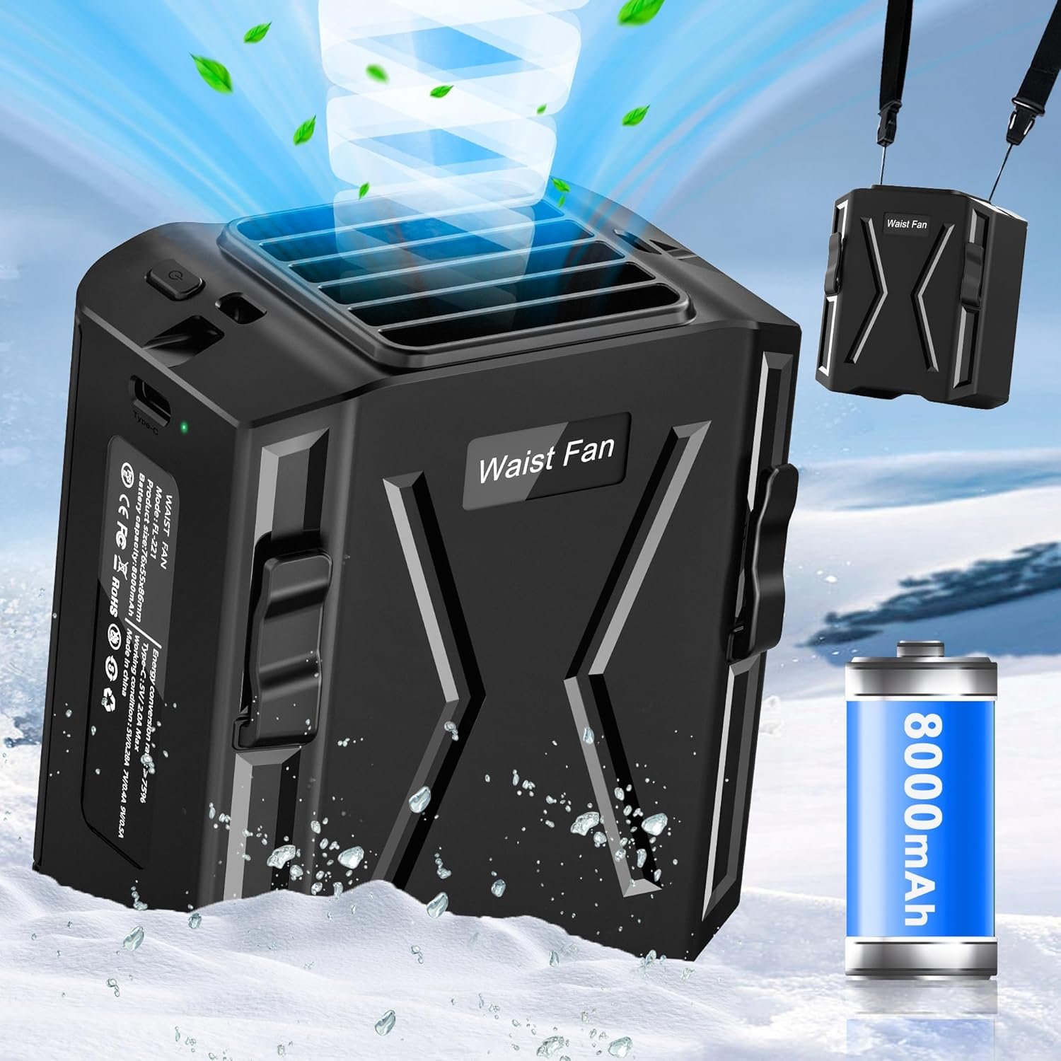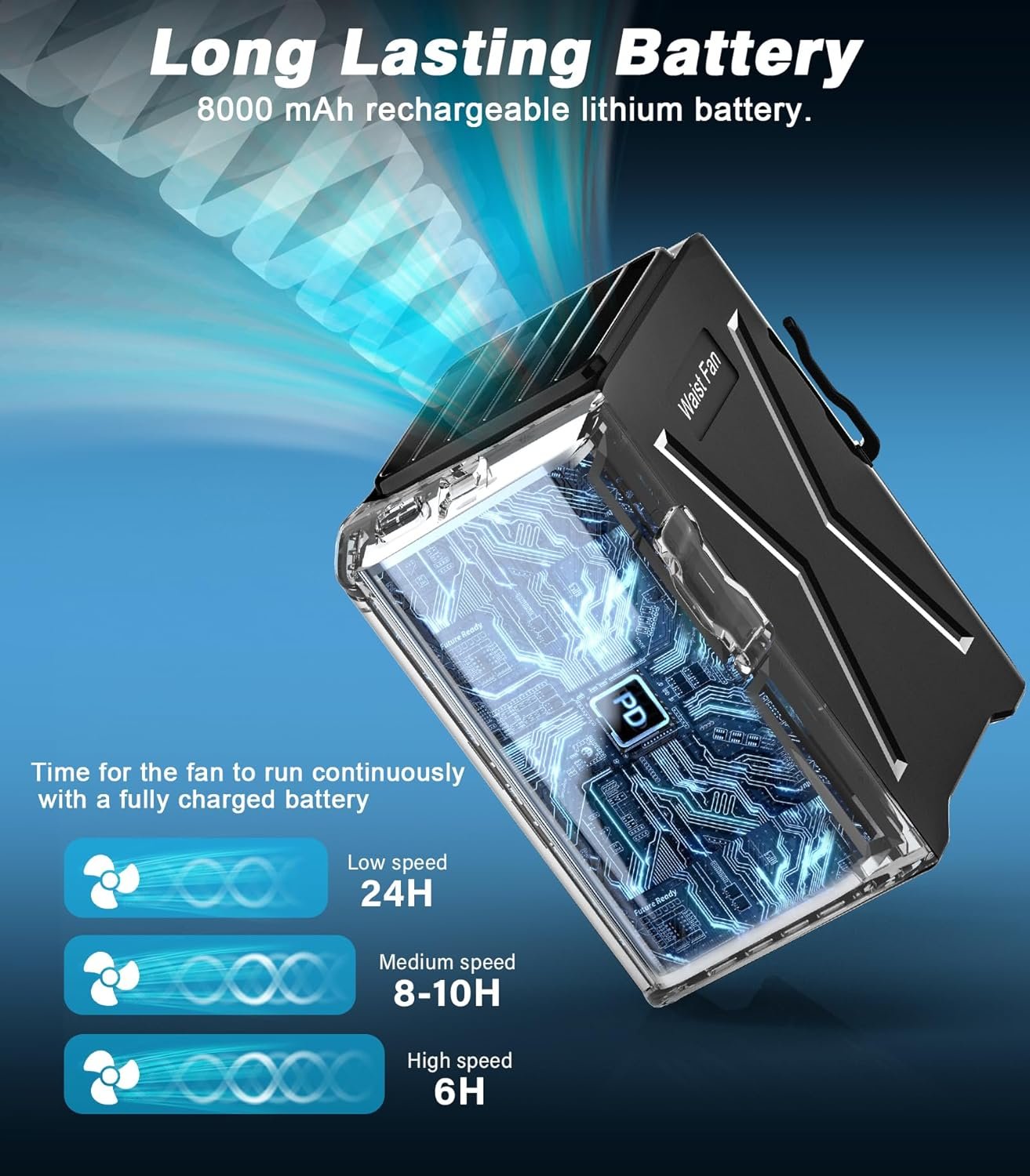 LONG-LASTING BATTERY: With an 8000mAh battery, this waist fan rechargeable provides 24 hours of unlimited use – first gear lasts 24 hours, second gear lasts 8-10 hours, and third gear lasts 6 hours. Say goodbye to power anxiety and enjoy worry-free cooling