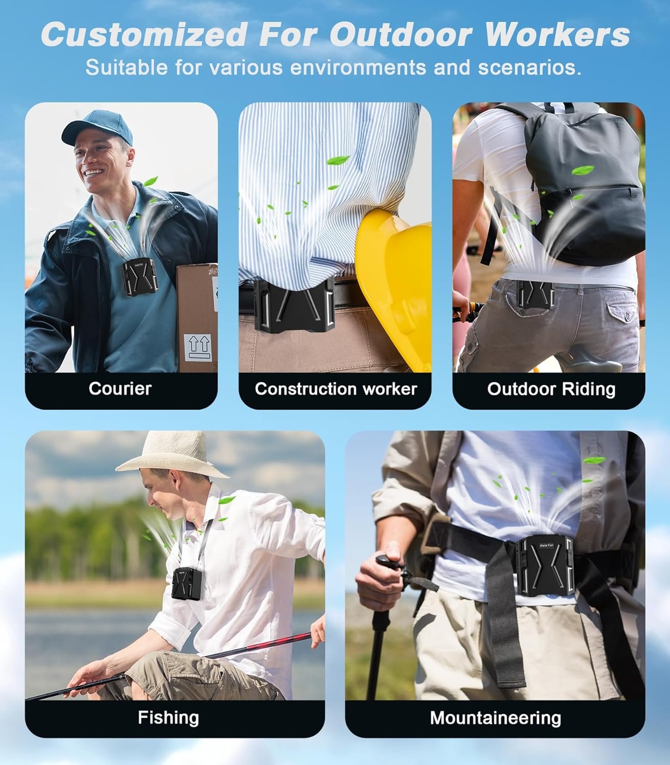 VERSATILE & CUSTOMIZED: This belt clip fan rechargeable under shirt is suitable for various environments and scenarios, including construction workers, couriers, sanitation workers, outdoor sports enthusiasts, chefs, and more. Our goal is to help you beat the heat and stay cool