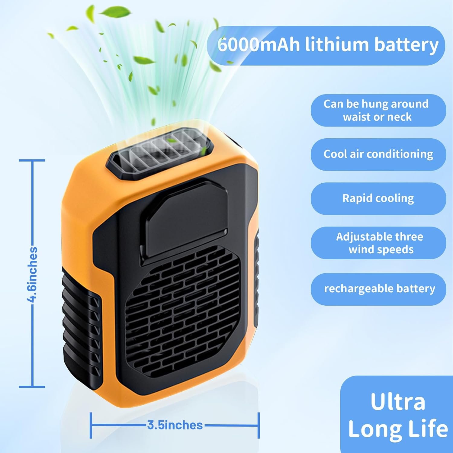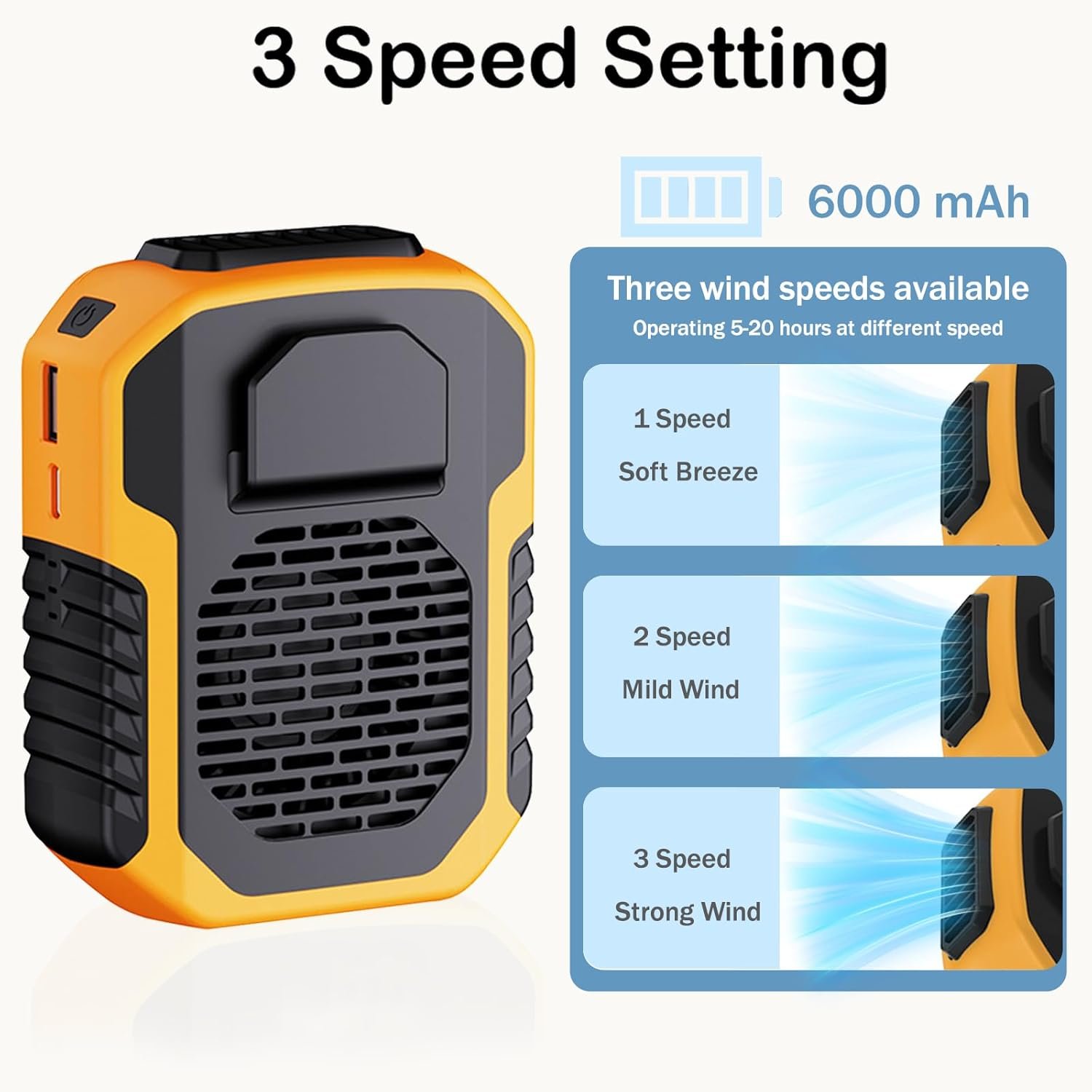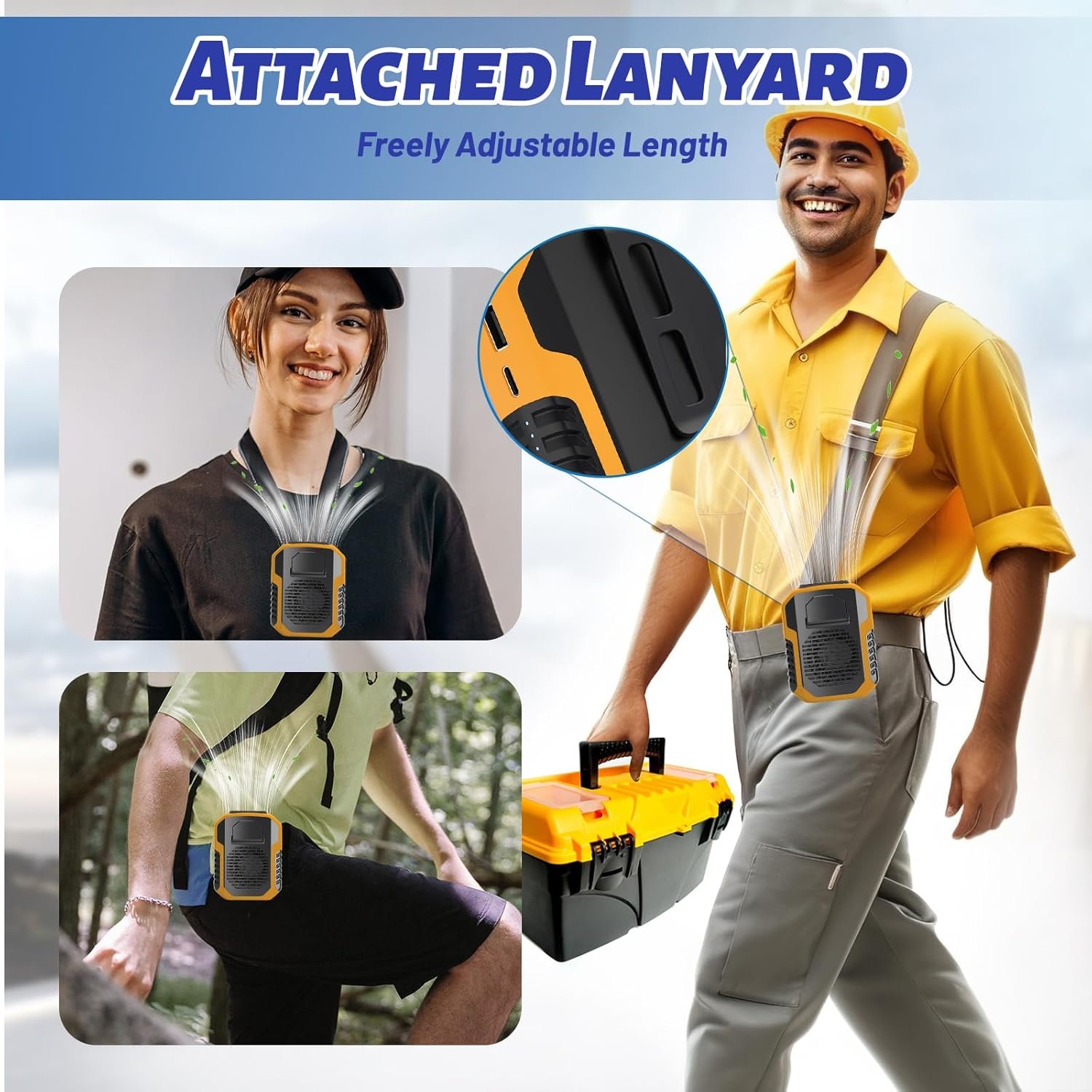 Powerful Wind and Quiet Operation:With a unique air inlet and outlet design, our portable neck fan rapidly delivers cool air with minimal noise. Featuring speeds up to 6000rpm, the powerful wind quickly dissipates body heat, keeping you cool during outdoor activities such as farming, gardening, backyard work, camping, traveling, fishing, and cycling