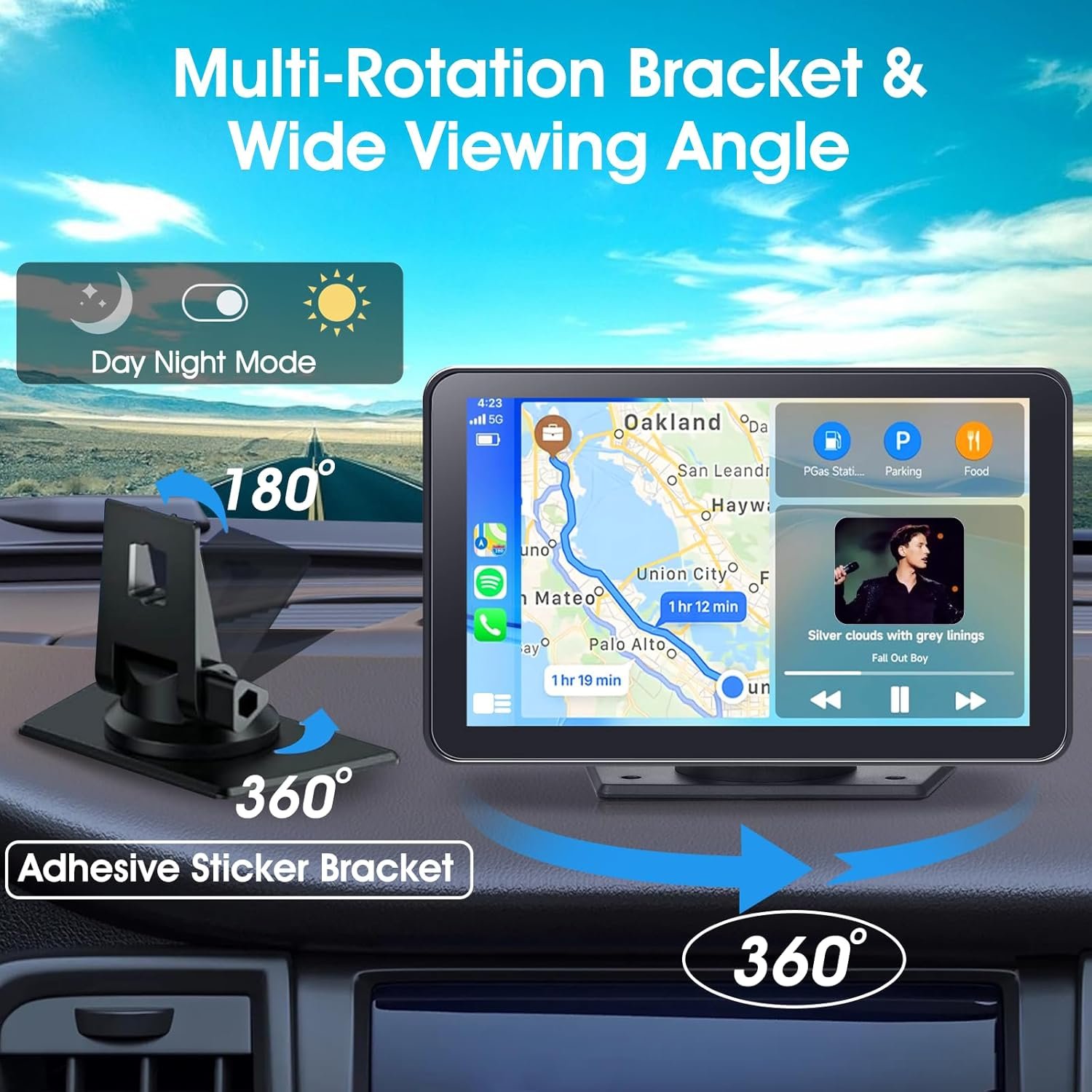 Add Carplay To Any Car: Portable Carplay Screen for Car’s working voltage is DC 12V~24V. Suitable for all different vehicles, like campers cars, RVs, trucks, pickups and vans, ect. Equipped with the 90 degree rotatable self-adhesive bracket, the car play display screen can be fixed to the dashboard console, convenient to install and disassemble as you need