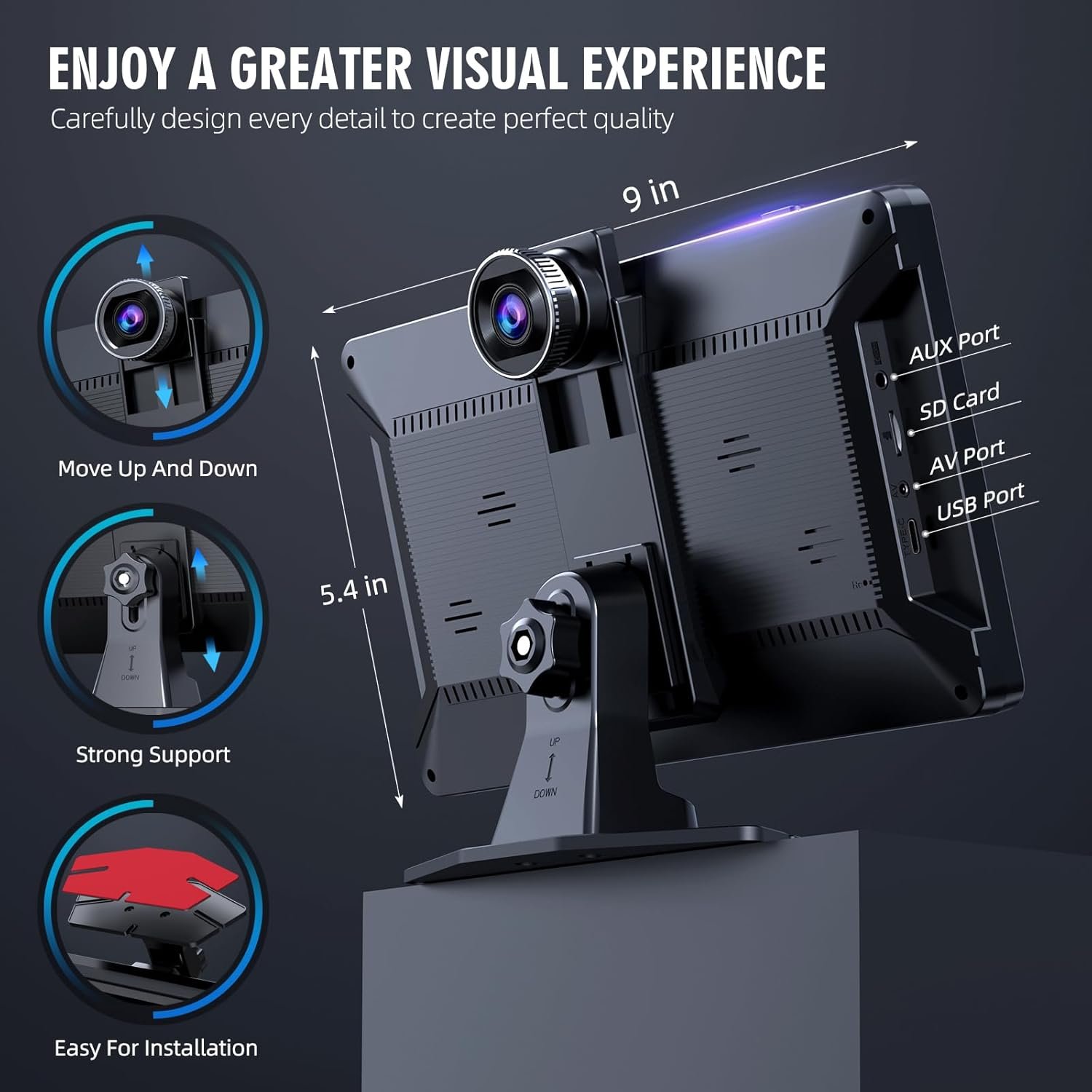 EASY INSTALLATION- With 3M rubber on the bottom of the bracket, making it convenient to both install & remove. The machine bracket and 4K front camera can be easily adjusted vertically, granting the user the flexibility to select their preferred height. The 64GB SD card is included and there is no need for a separate purchase. Plastic cover material and IPS touchscreen. The machine dimensions is 9 x 2.75 x 6.06 inches.