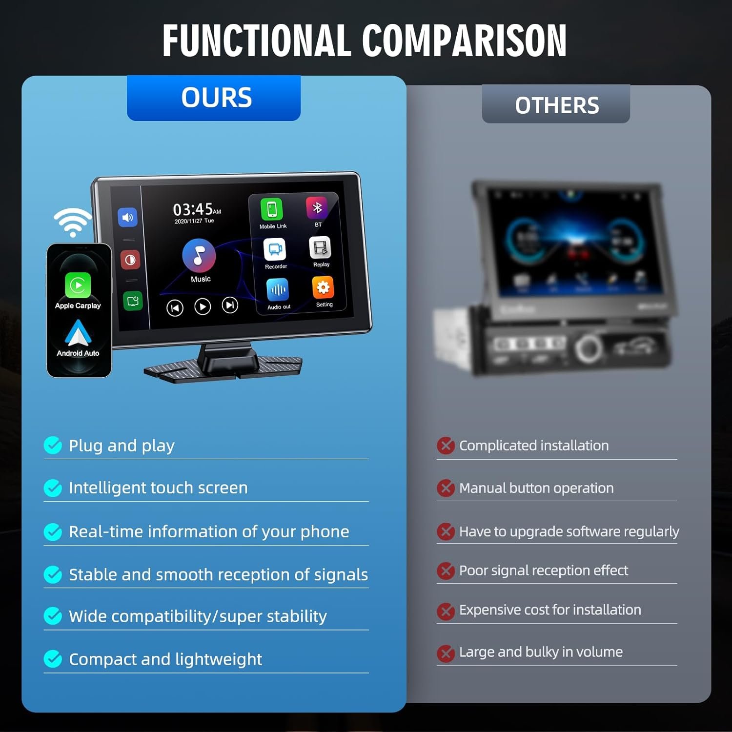 CARPLAY AND WIRELESS MIRRORING – The carplay provides four linking methods: Wireless Apple Carplay, Android Auto, Apple Mirror & Android Mirror. Simply connect via WiFi and BT for screen casting easily. Equipped with a 9-inch screen to provide a wider visual experience. With a voltage range of 5V-3A, it is compatible with most vehicles, including trucks, cars and station wagons, and more.