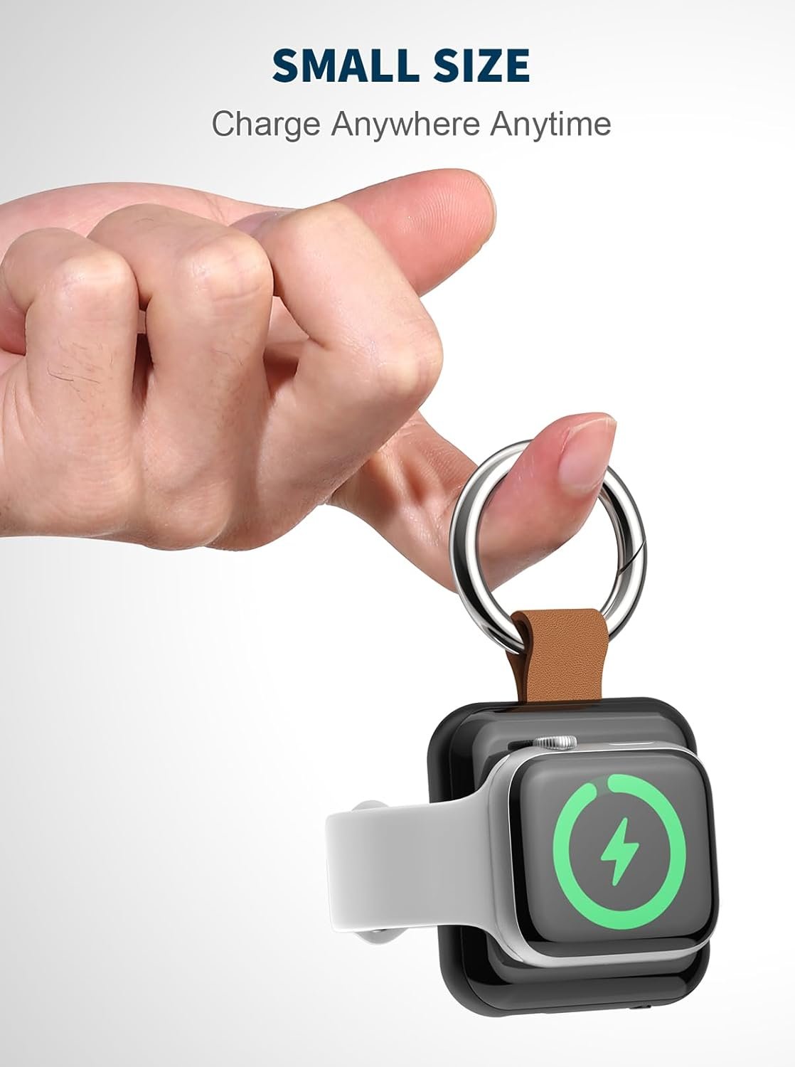 【Fashionably Portable】Our portable charger for Apple Watch boasts a stylish design, matching your watch’s size. With a glossy finish complemented by matte accents, and equipped with a metal keychain clip, it’s easy to carry. Four white battery indicator lights and a green charging status light keep you informed at all times.