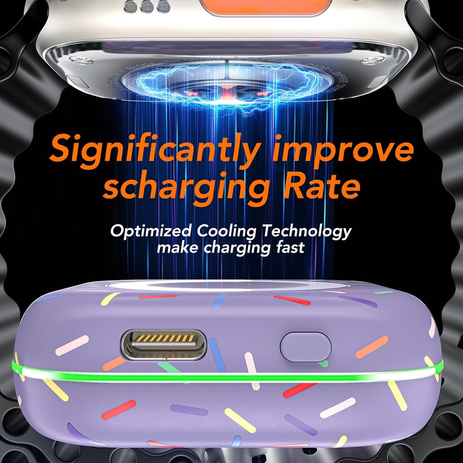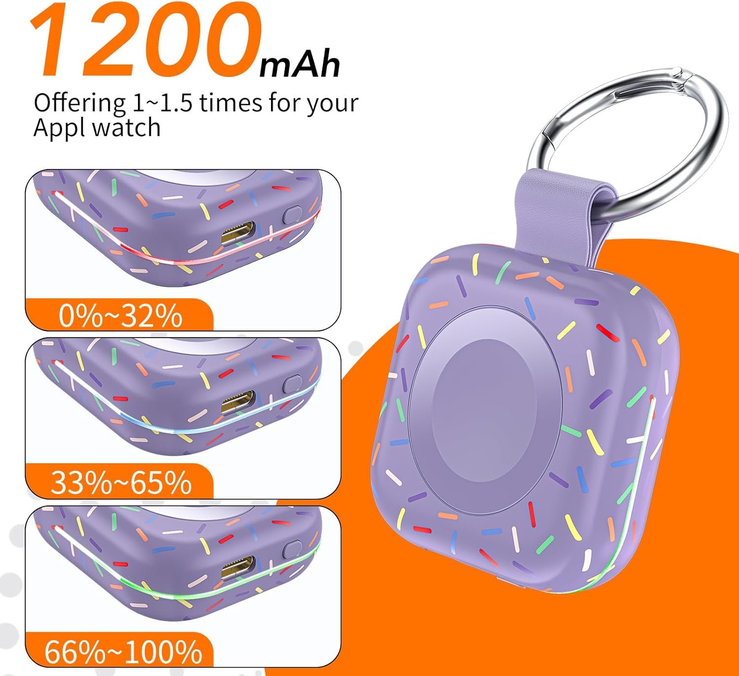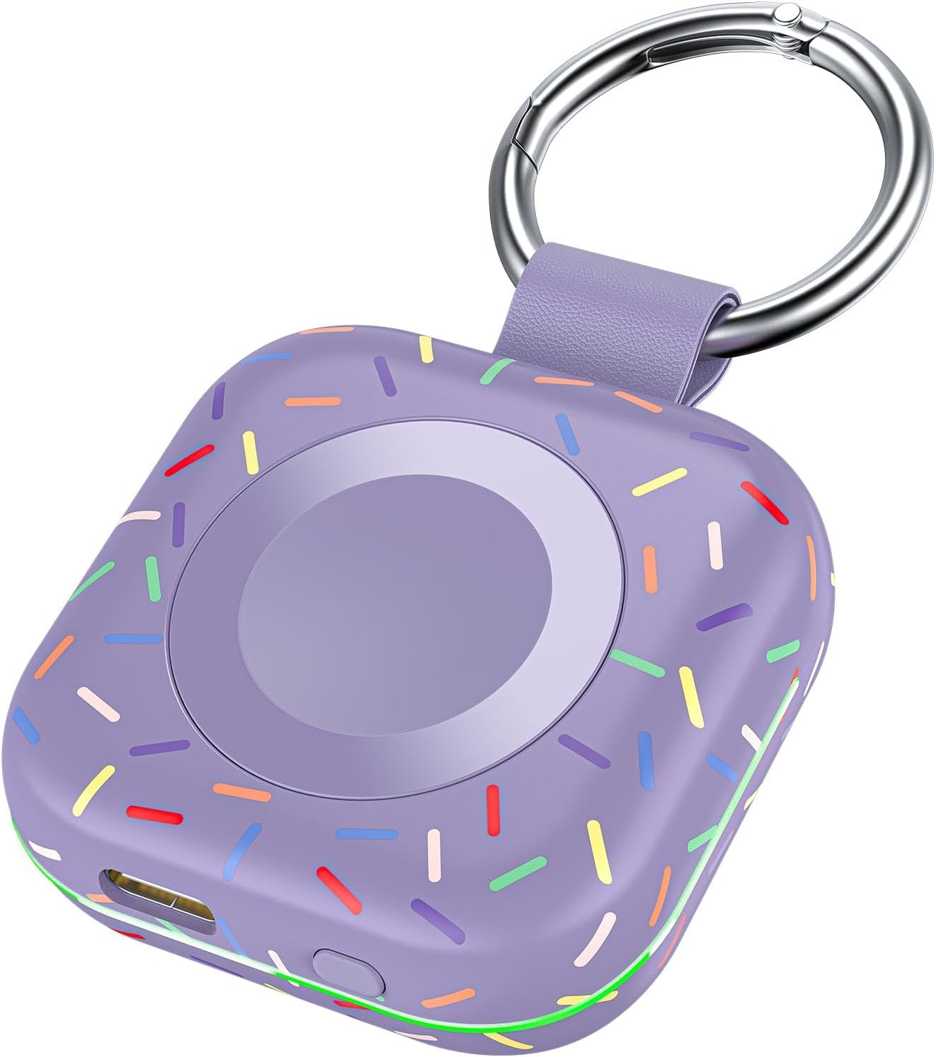 Mini Compact: The size of the cute keychain portable charger for apple watch is about the size of your watch.The comfortable frosted feel makes people love it.New indicator light design(0-30% Red Light,30%-60% Blue Light,60%-100% Green Light), fashion, keychain design,Convenient for all kinds of travel