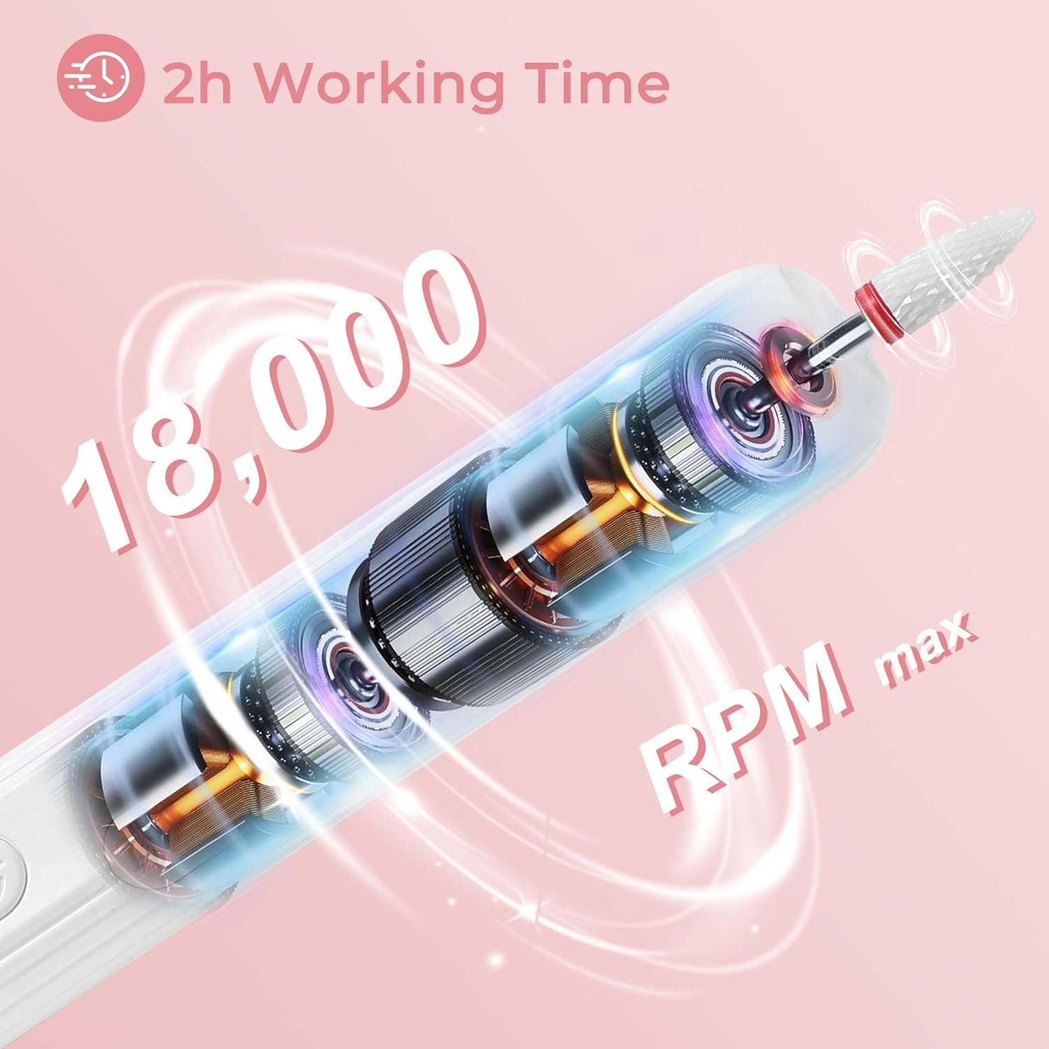 【EFFICIENT AND VERSATILE】Kiaryuoll Electric Nail Drill with 18000 RPM, 3 adjustable speeds, bidirectional rotation, and LED light for precise nail grooming. Supports wireless charging for up to 2 hours of continuous use