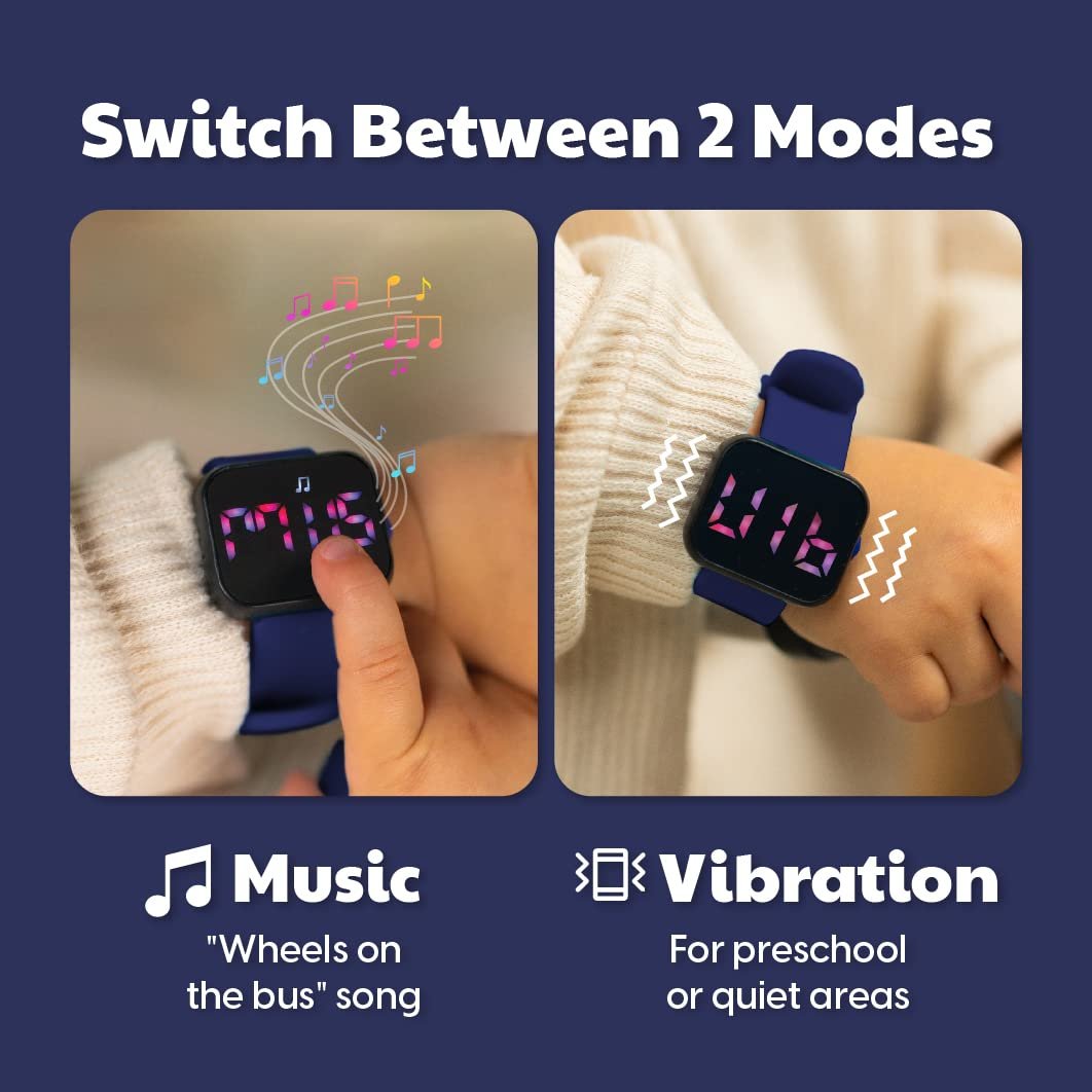 POTTY TRAIN YOUR KIDS EASILY WITH A FUN MELODY ALARM – the watch is programmable to play the tune “Wheels on the Bus” to remind your kid to go do their toilet business every 30, 60, 90 mins or 2 hours, and automatically recurs. The watch can switch from music to vibration if needed for school or quiet areas.
