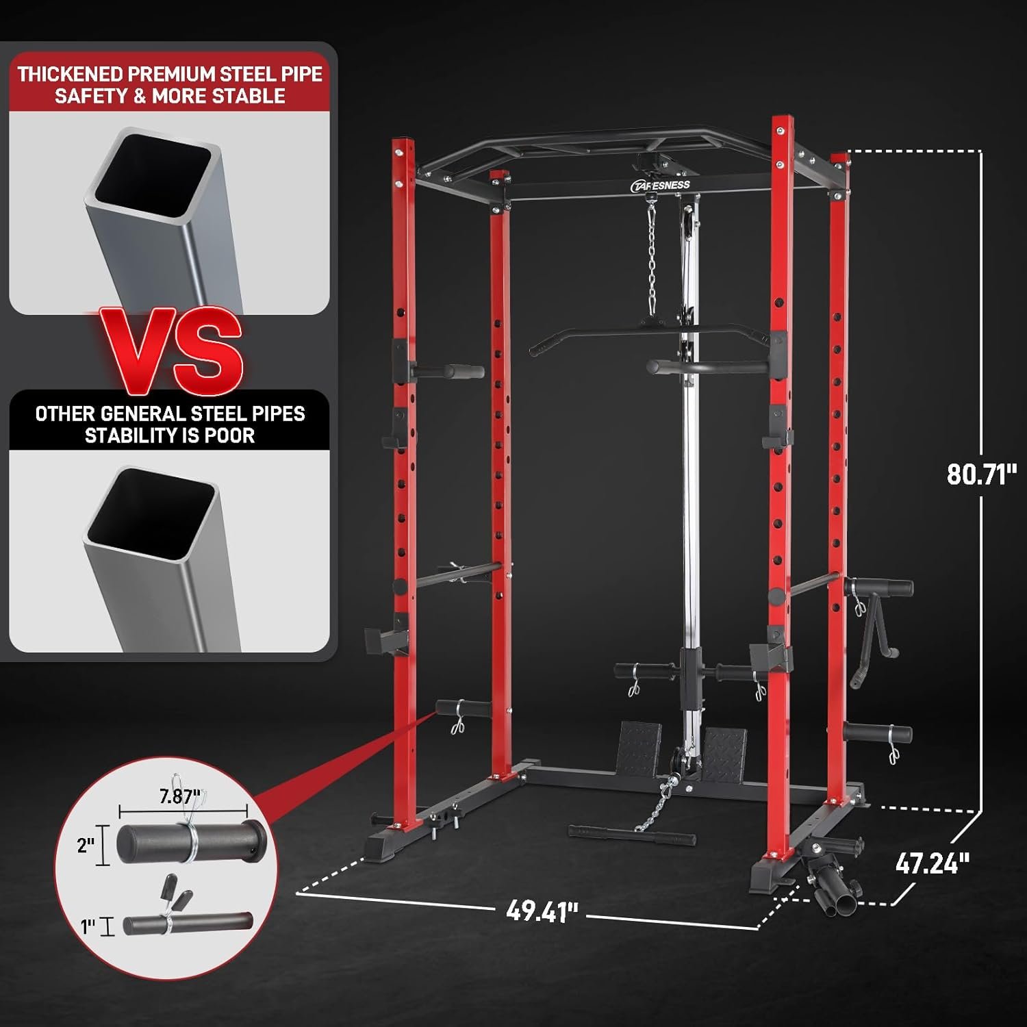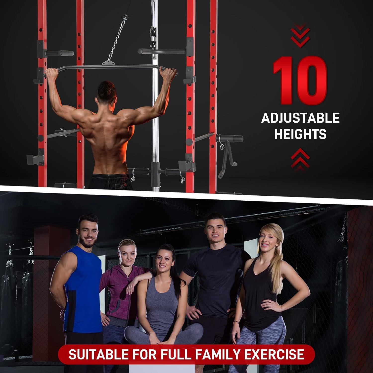 EFFECTIVE WHOLE BODY WORKOUT: Our power rack cage not only can be performed on the mainframe including squat, bench press, pull up, dip station, etc. It is also equipped with an upper and lower pulley system for lat pulls down, bicep curl, tricep extensions, cable crossover, seated rowing and kick back. Come with the landmine equipment and T bar to support you in landmine exercises, allowing for a wide range of exercises in a limited space