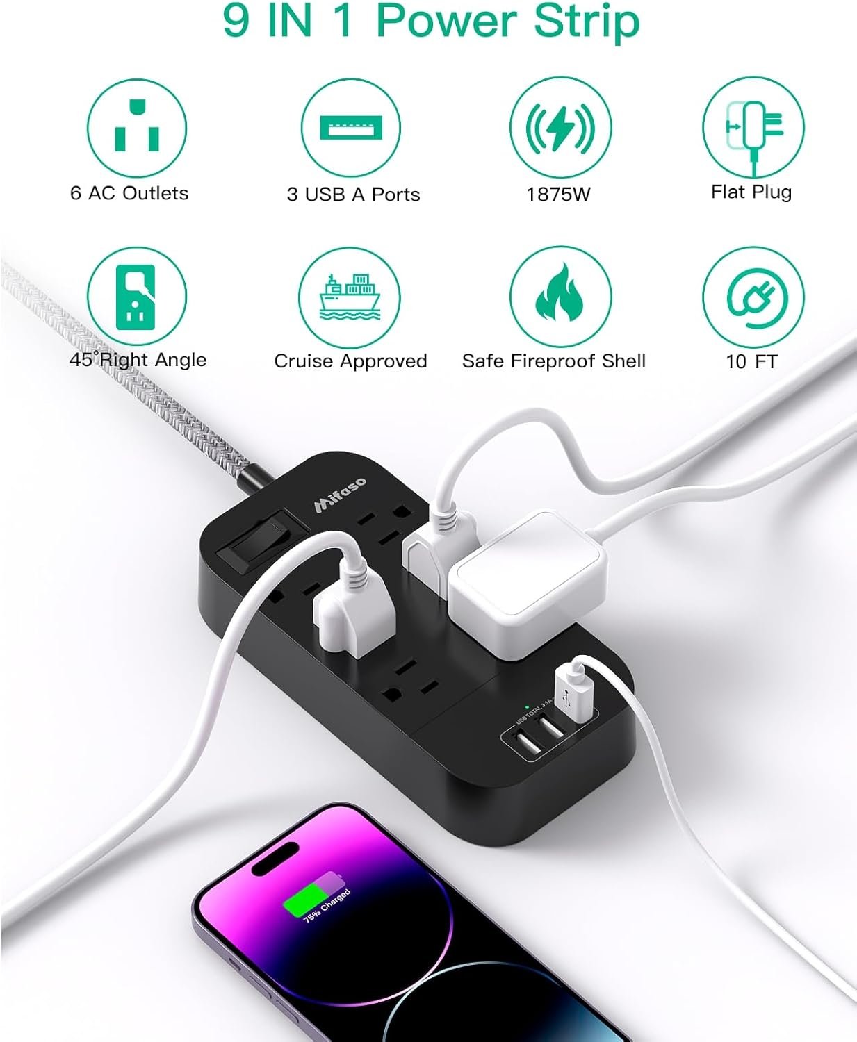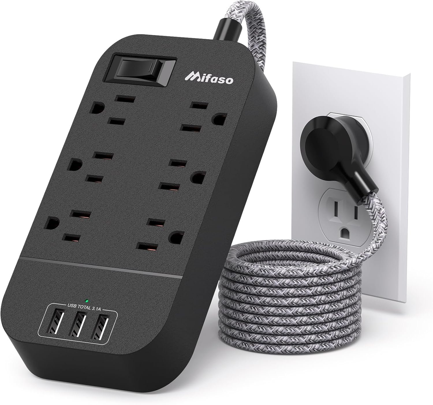 【POWER STRIP WITH USB】 – The extension cord with 6 ac outlets and 3 USB, built-in smart charging technology, the USB charger will detect your devices automatically and deliver the fastest charge speed up to 2.4A ( 5V/2.4 Max Each Port ), 3 USB ports ( Total 5V/3.1A/15W) can charge almost any USB device (smartphone, tablet, Amazon Kindle, fire stick, e-reader, blue tooth headphones, portable speaker, etc).