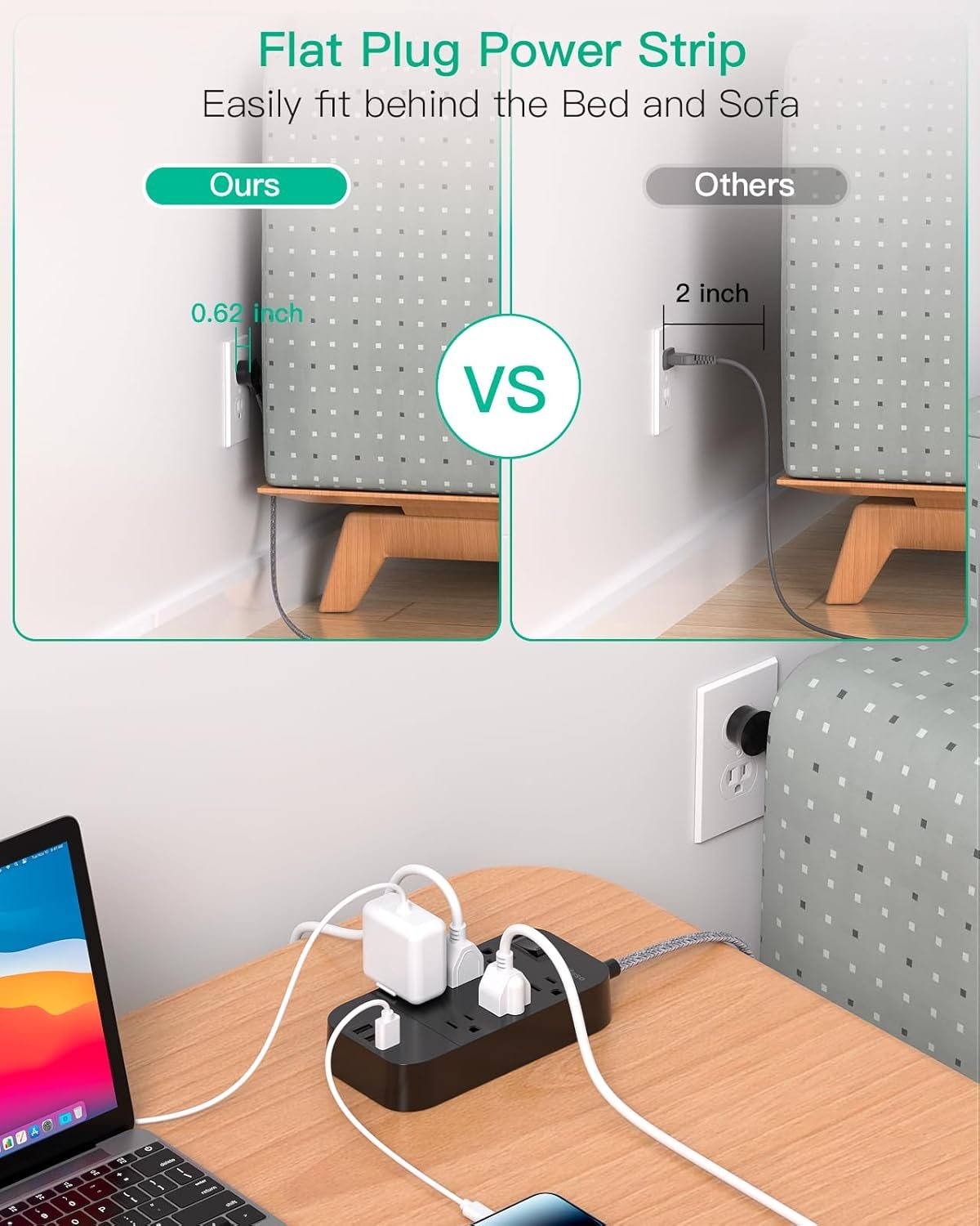 0.62 inch plug allows the power cord to sit close to the wall so that it could be easily hidden in the back of the furniture, bed, and refrigerator.