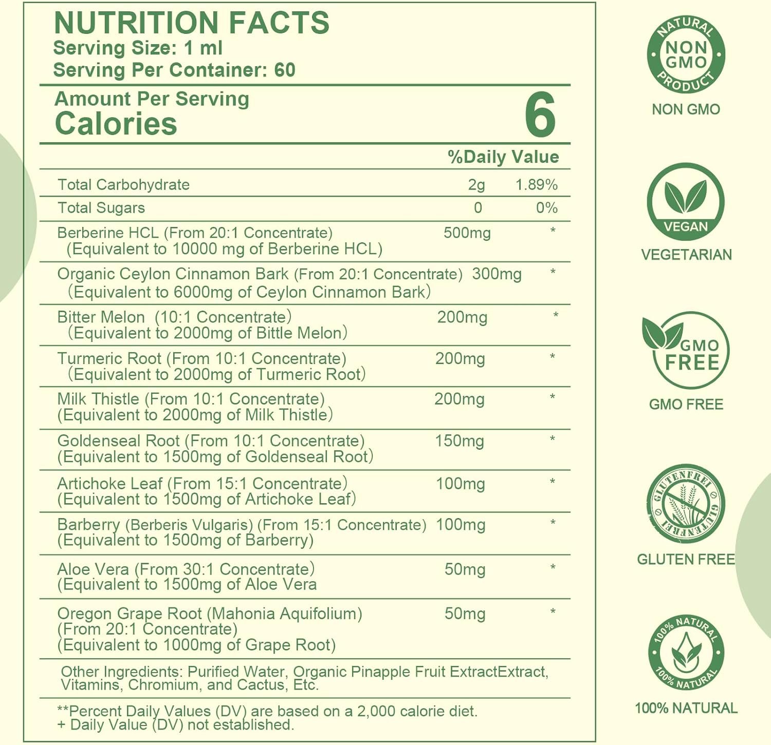 【Berberine Supplement】Berberine liquid drops supplement made with natural ingredients.We extract key elements from natural herb ingredients.We’ve combined a unique blend of more naturally sourced herbs extracts Berberine HCI, Aloe vera, Bitter Melon, Ceylon Cinnamon, Milk Thistle, Turmeric, Artichoke Leaf, Chromium, Cactus, Turmeric Curcumin Root, Goldenseal Root, Black Pepper, and Vegetable Cellulose. Berberine and Turmeric ingredients combine forces to enhance your digestion health.