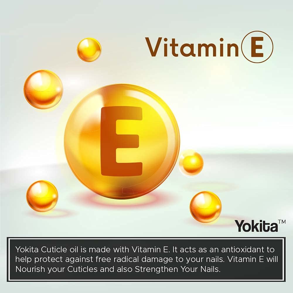Yokita Cuticle oil is made with Vitamin E. It acts as an antioxidant to help protect against free radical damage to your nails. Vitamin E will Nourish your Cuticles and also Strengthen Your Nails.