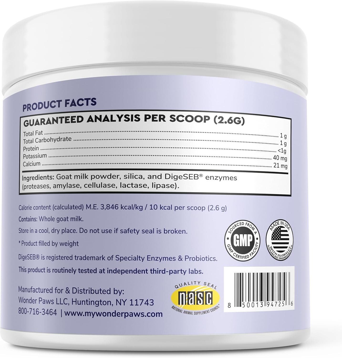NASC CERTIFIED: Wonder Paws is a member of the prestigious National Animal Supplement Council (NASC), which ensures strict quality control standards. Wonder Paws goat milk powder for dogs is NASC Certified so you know you are getting a trusted product that adheres to stringent quality controls. Our dry goats milk for dogs with probiotics and enzymes is manufactured in the United States with globally sourced ingredients in an FDA registered and GMP Certified facility.