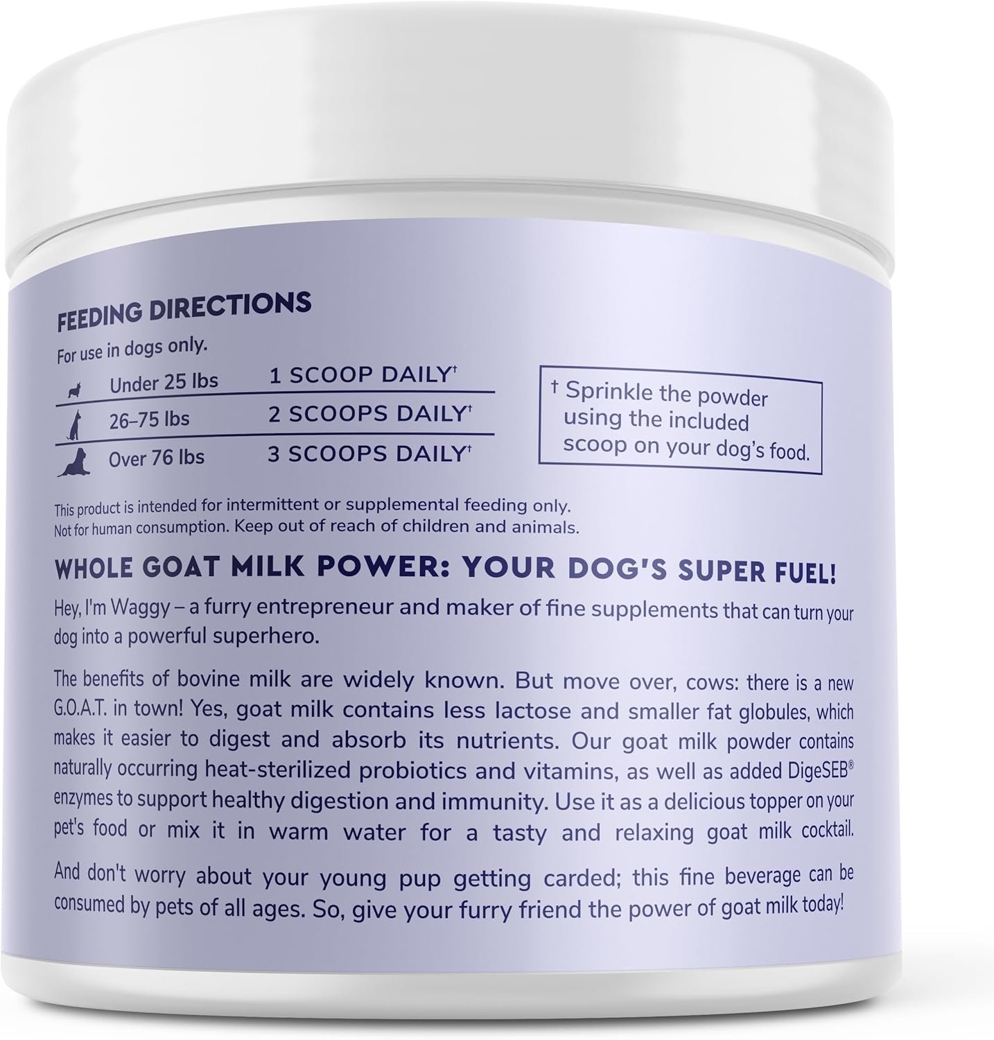 POWERFUL GOAT MILK FOR DOGS: Wonder Paws powdered goat milk for dogs uses the highest quality goat milk with naturally occurring probiotics and added enzymes to help support healthy digestion, immunity and allergies. Whether your pet is a puppy or an adult, our whole powdered goat milk for dogs helps provide the same benefits as raw goat milk but in an easy to use food topper. Just add water to our goat milk supplement for dogs to create a nourishing drink or pour over your pet’s food as a delicious topper!