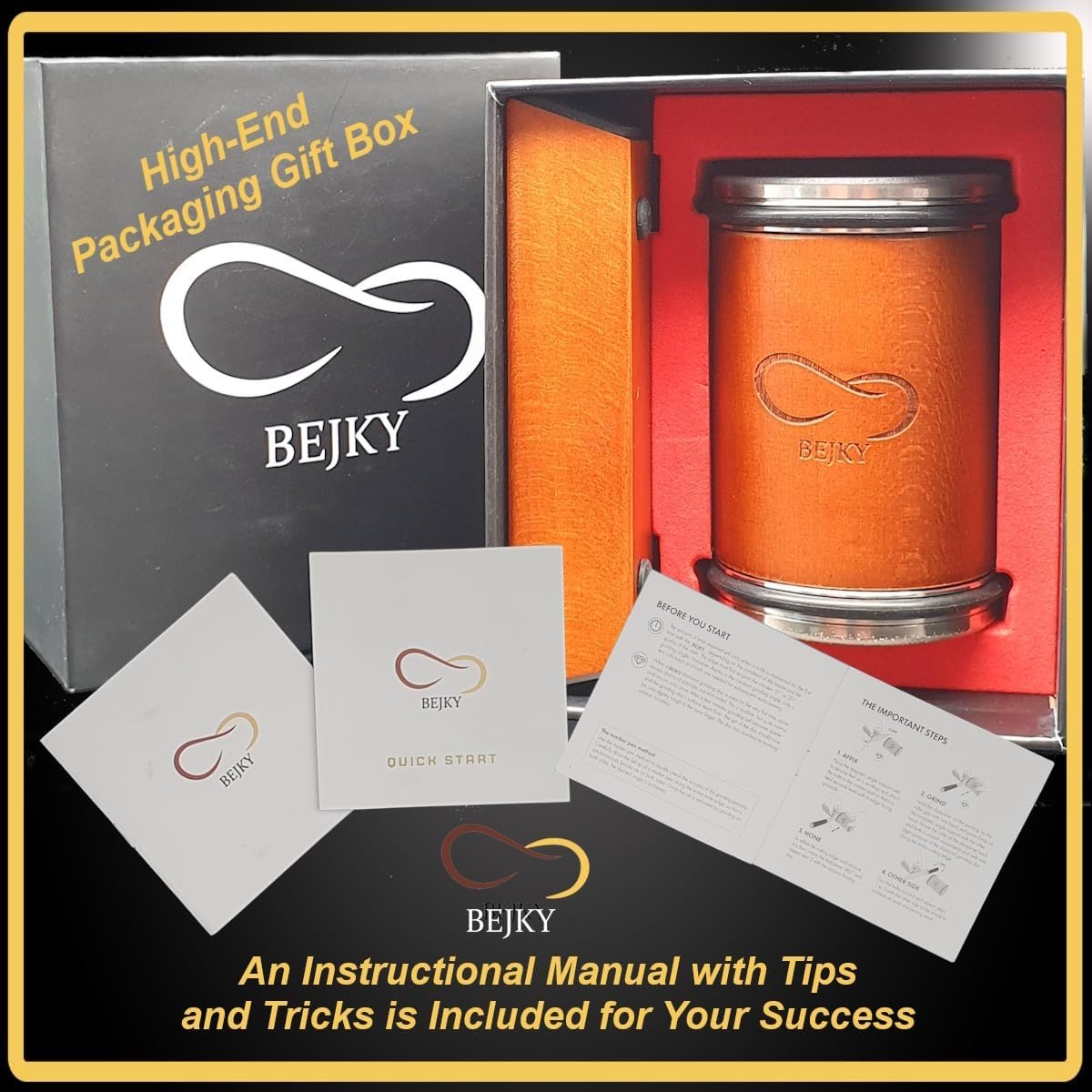 GIFT BOX PACKAGING – Delivered to you in a High-End Packaging Gift Box that adds a touch of elegance and sophistication, making the unboxing process more enjoyable and memorable both for you and the receiver. The BEJKY Rolling Knife Sharpener Kit will be the Ultimate Gift to any Birthday Party, Mom or Dad, Professional Chefs, Hunters, Outdoor Peoples or Family and Friends. A well-written and informative instruction manual is included to help you to get your dull knives living again.