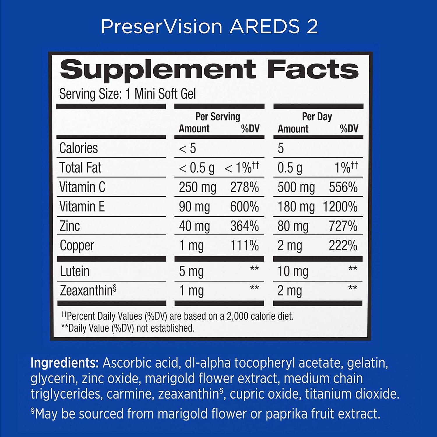 PRESERVISION AREDS 2 S: This formula uses Lutein and Zeaxanthin, zinc, copper, Vitamin C and Vitamin E to exactly match the nutrient formula recommended by the AMD experts at the National Eye Institute based on the Age Related Eye Disease Study 2.
