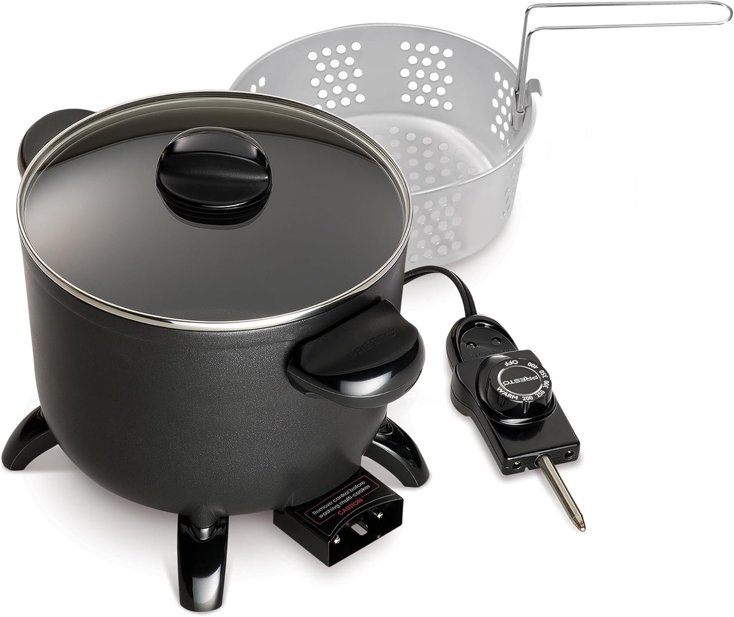 Deep fry up to six servings of french fries in this versatile Kitchen Kettle. Make soups and casseroles, cook rice and pasta, steam fish and vegetables, and roast beef, pork, and poultry. Ceramic nonstick surface, inside and out, provides stick-free cooking and easy cleaning. Fry/steam basket hooks onto rim of cooker for easy draining. Fully immersible with Control Master® heat control removed.