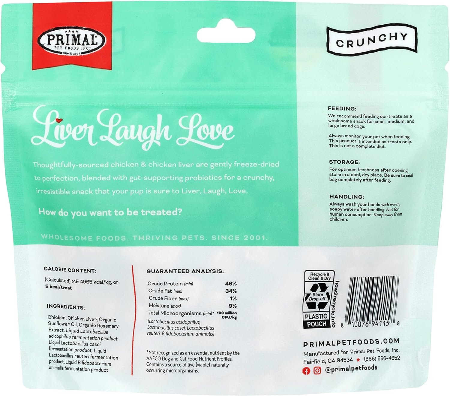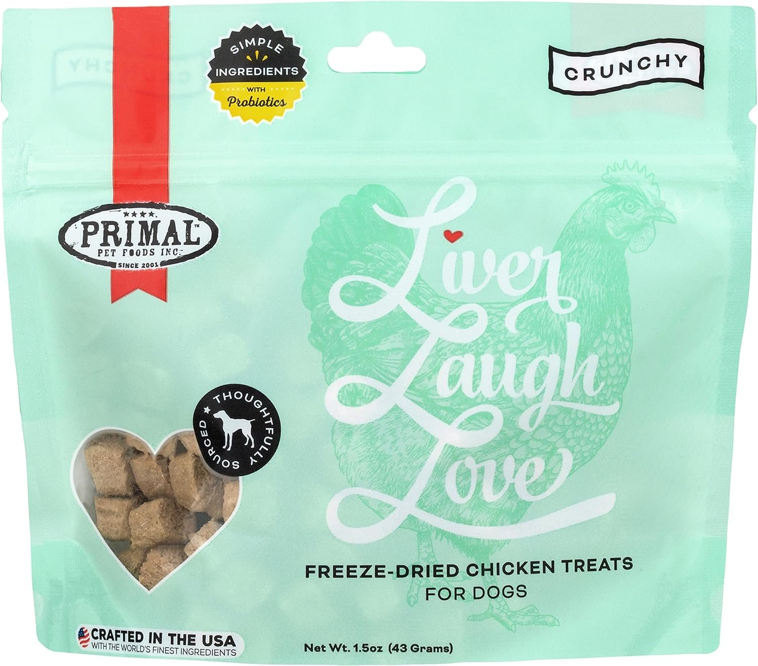 Primal Freeze Dried Dog Treats; Chicken Liver Dog Treats with Probiotics for Dogs; Liver, Laugh, Love; Crunchy Grain Free Training Treats for Dogs, 1.5 oz