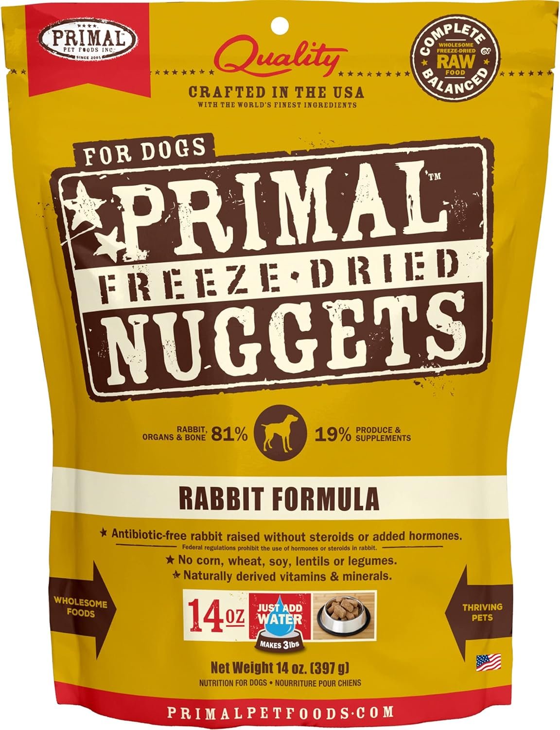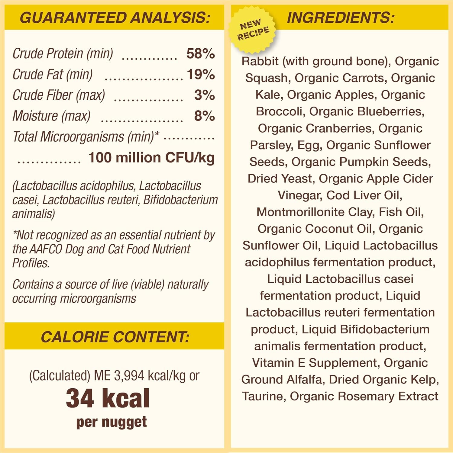 Premium freeze dried raw dog food made with grass-fed, antibiotic-free rabbit raised without steroids or added hormones and with USDA certified organic fruits and vegetables. Grain free