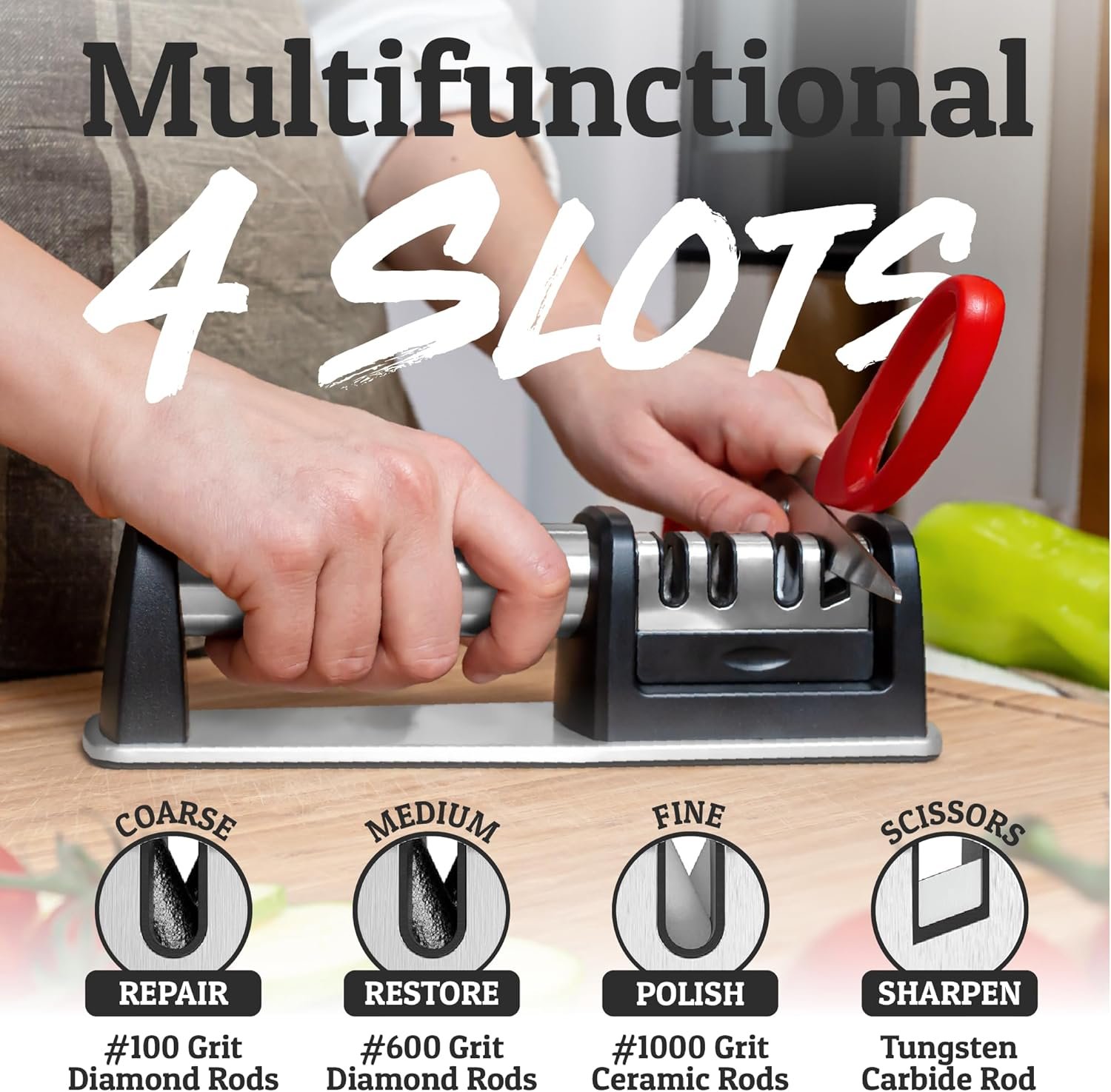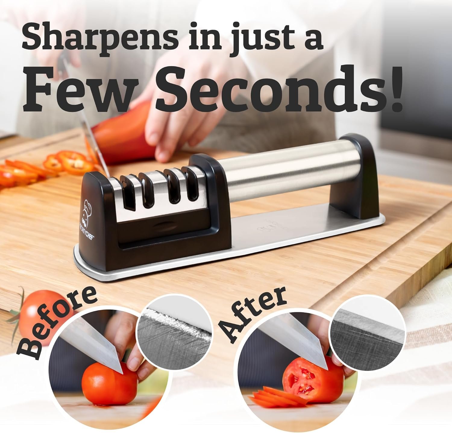Easy Use, Expert Results: Restore stainless steel kitchen and utility knives with our professional-grade kitchen knife sharpener recommended by expert chefs. Just a few quick strokes of the best knife sharpener and scissors sharpener on Amazon to bring your blades back to life.