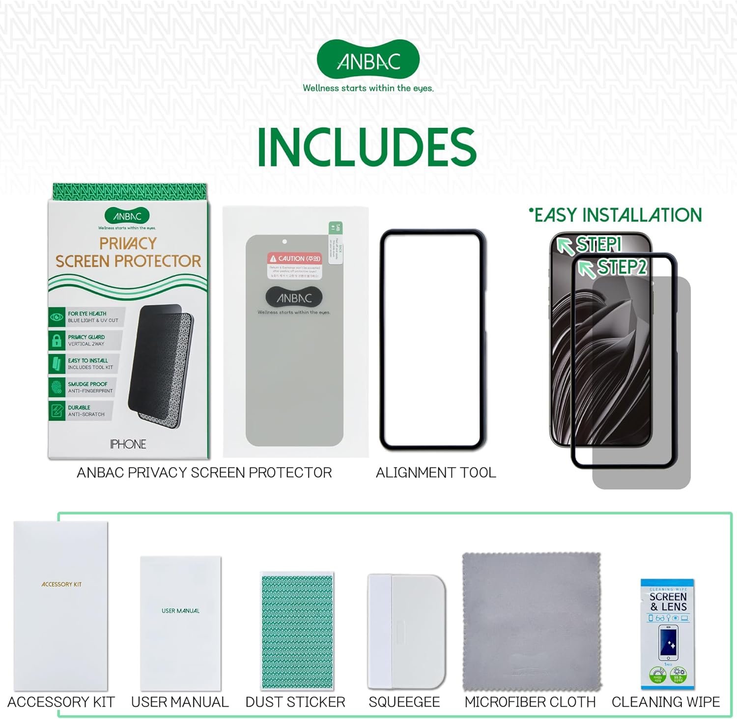 ☘️ PACKAGE CONTENTS & COMPATIBILITY – Each package includes one ANBAC privacy screen protector which includes the best Korean-made core material, an easy installation alignment tool, a quality microfiber cleaning cloth, two dust removal stickers, a wet tissue & squeegee. This protector is compatible with Apple iPhone 15Pro 6.1” display.