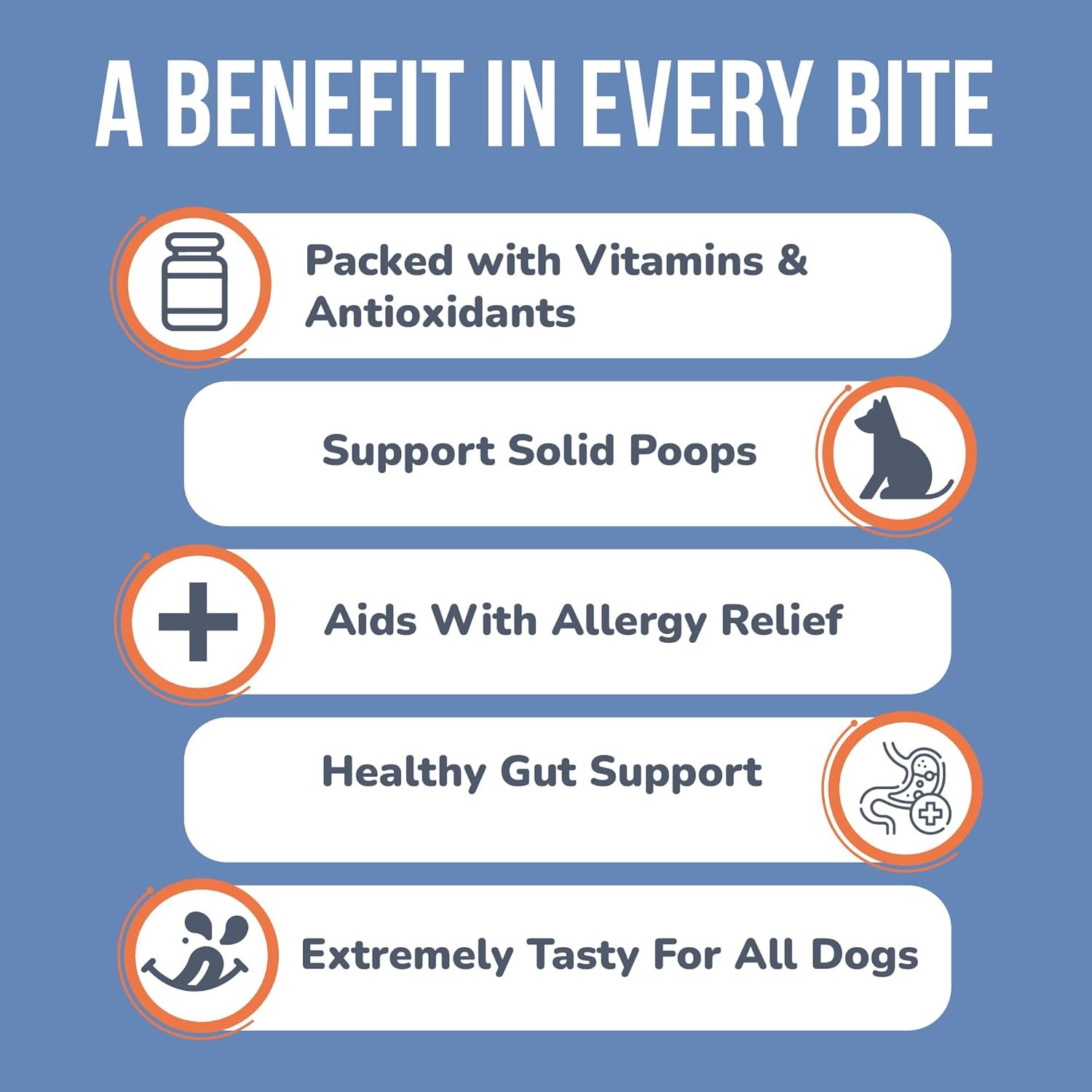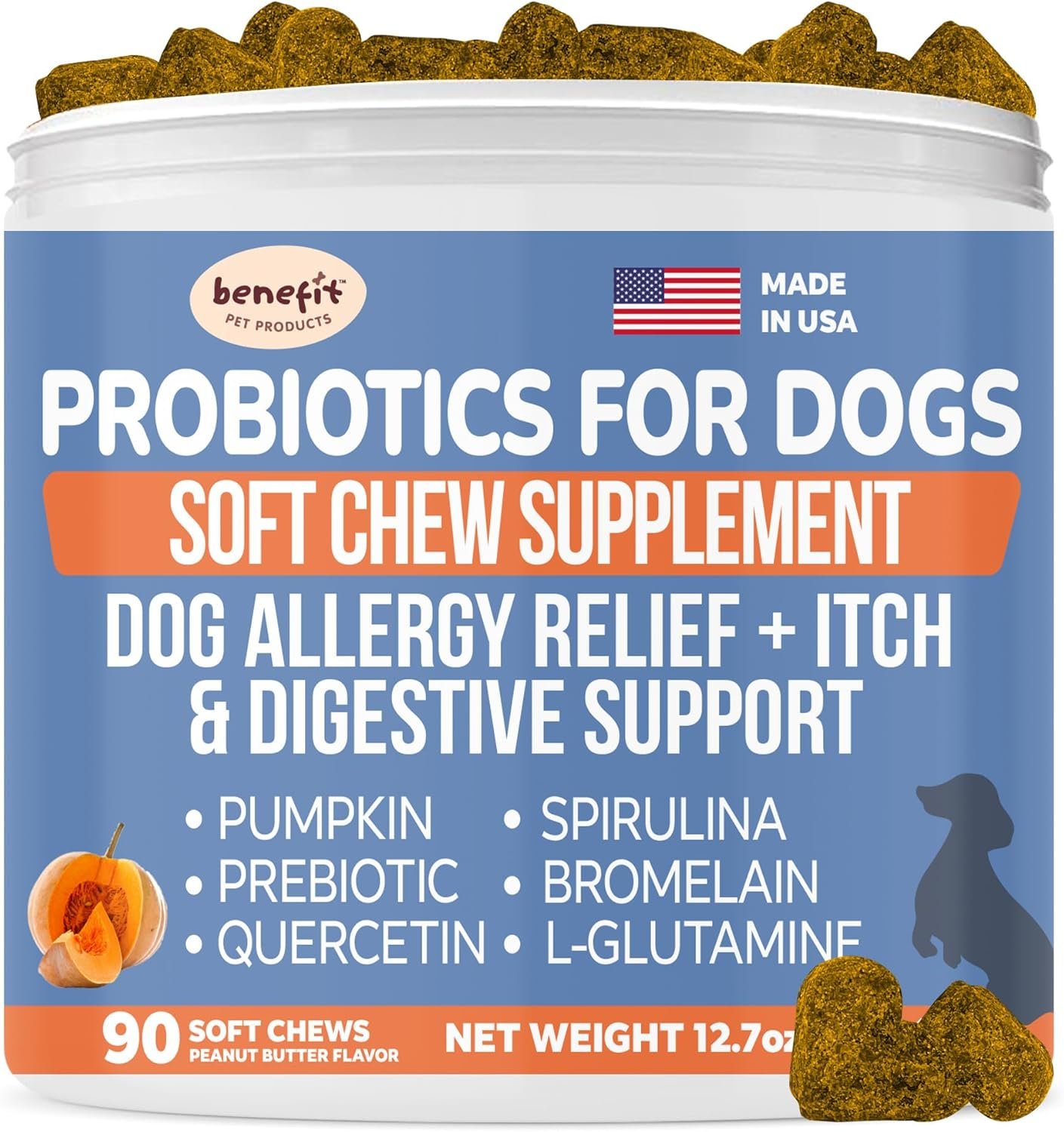 CAN IMPROVE DOG ALLERGIES, Say goodbye to itchy skin, these dog allergy chews can combat all dog allergies including inflammation. Packed with dog probiotics for yeast, itchy skin, itchy ears, shedding hair, and hot spots. Conventional pet foods often contribute to itchy skin troubles. With Benefit Pet, say goodbye to mystery meats and fillers, and hello to digestive superfoods like ginger and pumpkin for dogs, and quercetin for dog allergies.