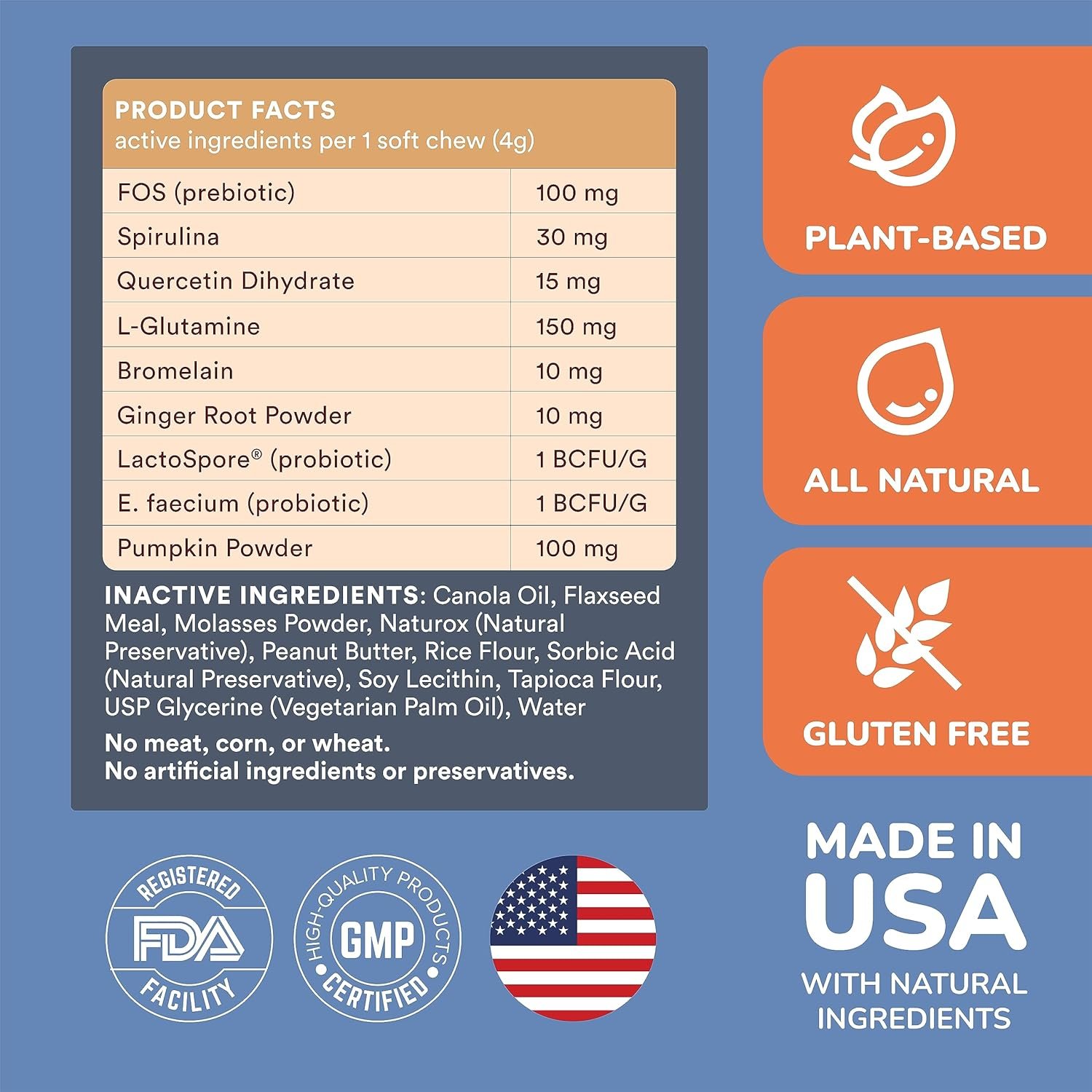 PROBIOTIC CHEWS FOR DOGS, Our soft chews are enriched with fiber and digestive enzymes with probiotics and prebiotics for dogs. Each soft chew also includes pumpkin powder for dogs, plus ginger, Spirulina, Quercetin with Bromelain for dogs. These unique dog probiotic chews provide essential nutrients without artificial additives, catering to your pet’s nutritional needs and dog allergy support by being grain free, wheat free, and gluten free.
