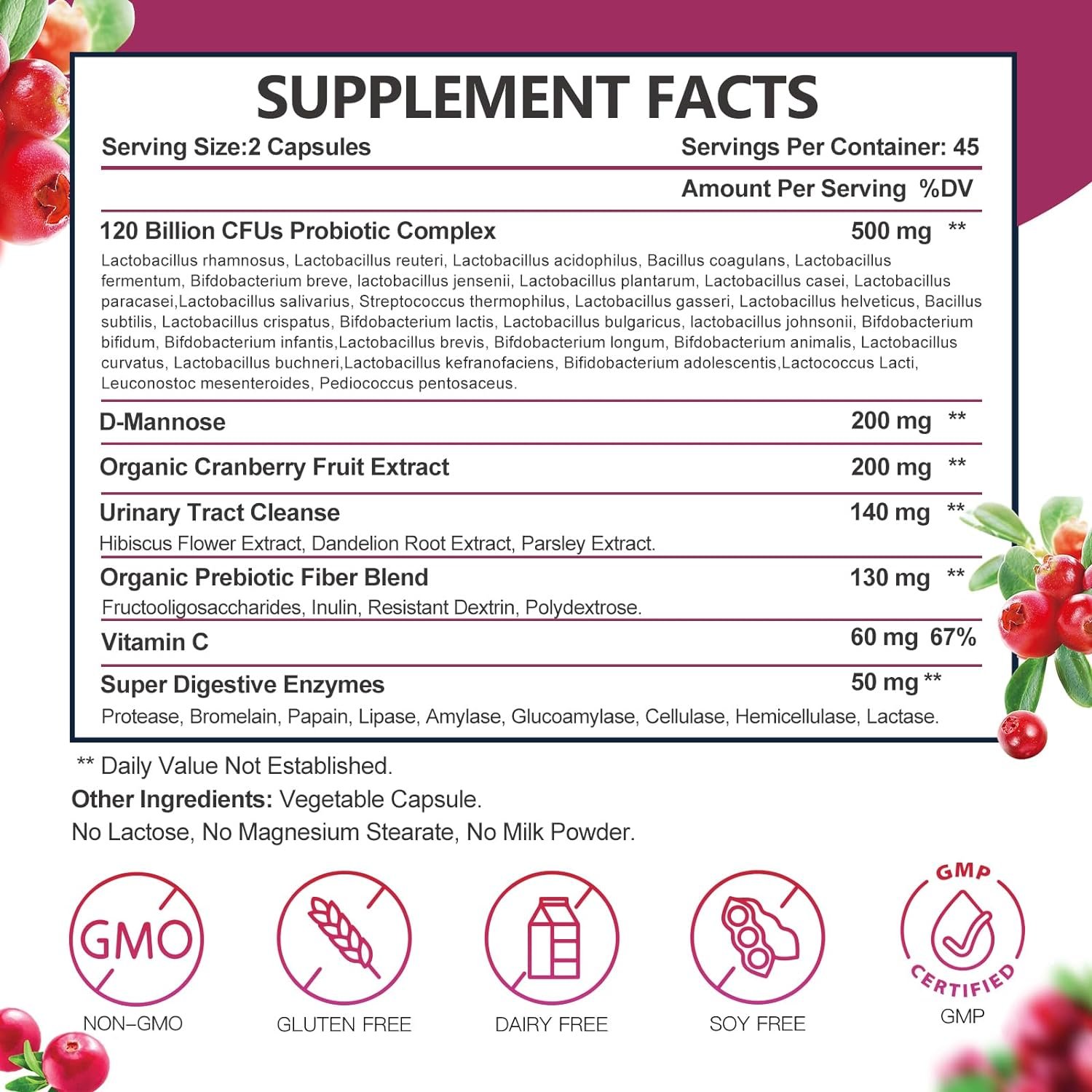 Probiotics for Women Digestive Health, Vaginal probiotics 120 Billion CFU 31 Strains with Digestive Enzymes & Prebiotics & D Mannose & Cranberry for Urinary Tract, 90 Capsules