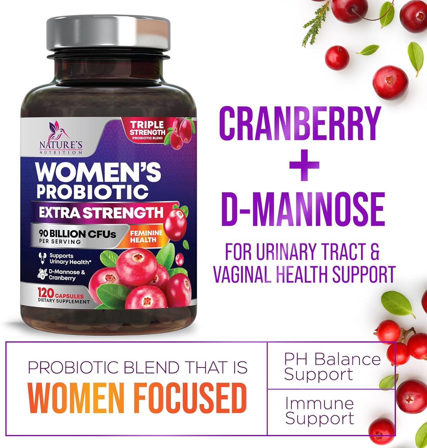 Probiotic Fusion: Experience the synergy of cranberry and probiotics offering a natural approach to womens vaginal health and urinary tract support