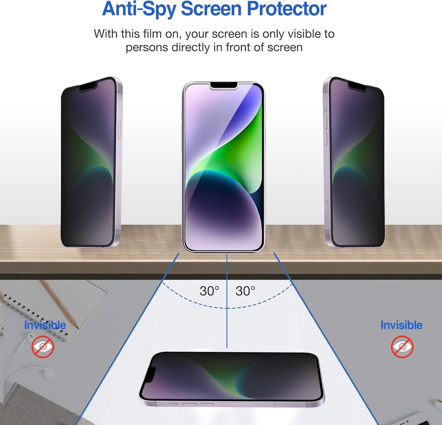 With this film on, your screen will only be visible to persons directly in front of screen in portrait mode (Please note that the privacy cover will darken the screen a little to prevent the peeking eyes near you, so please turn up your device display brightness for better viewing experience)