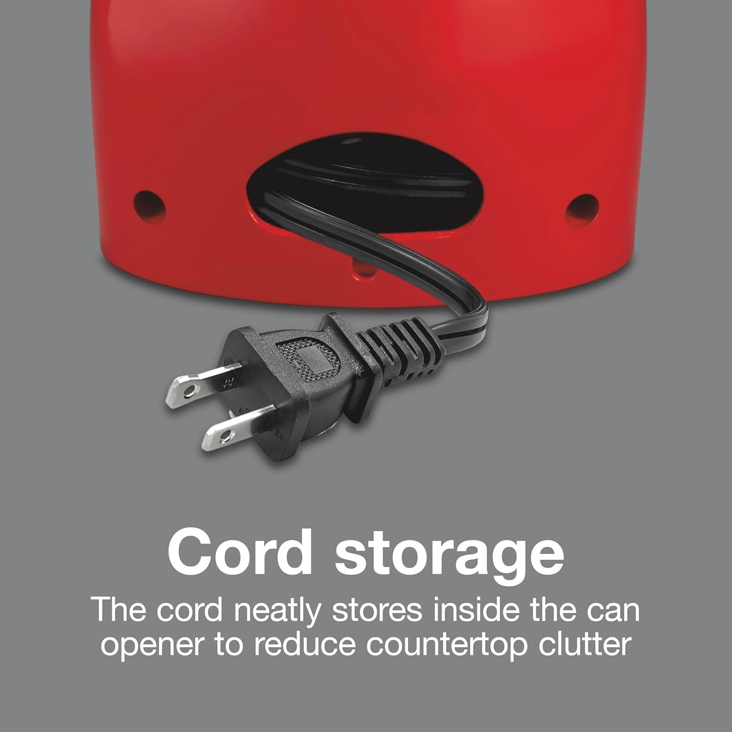 CORD STORAGE: The cord neatly stores inside the base of the automatic can opener to reduce countertop clutter.