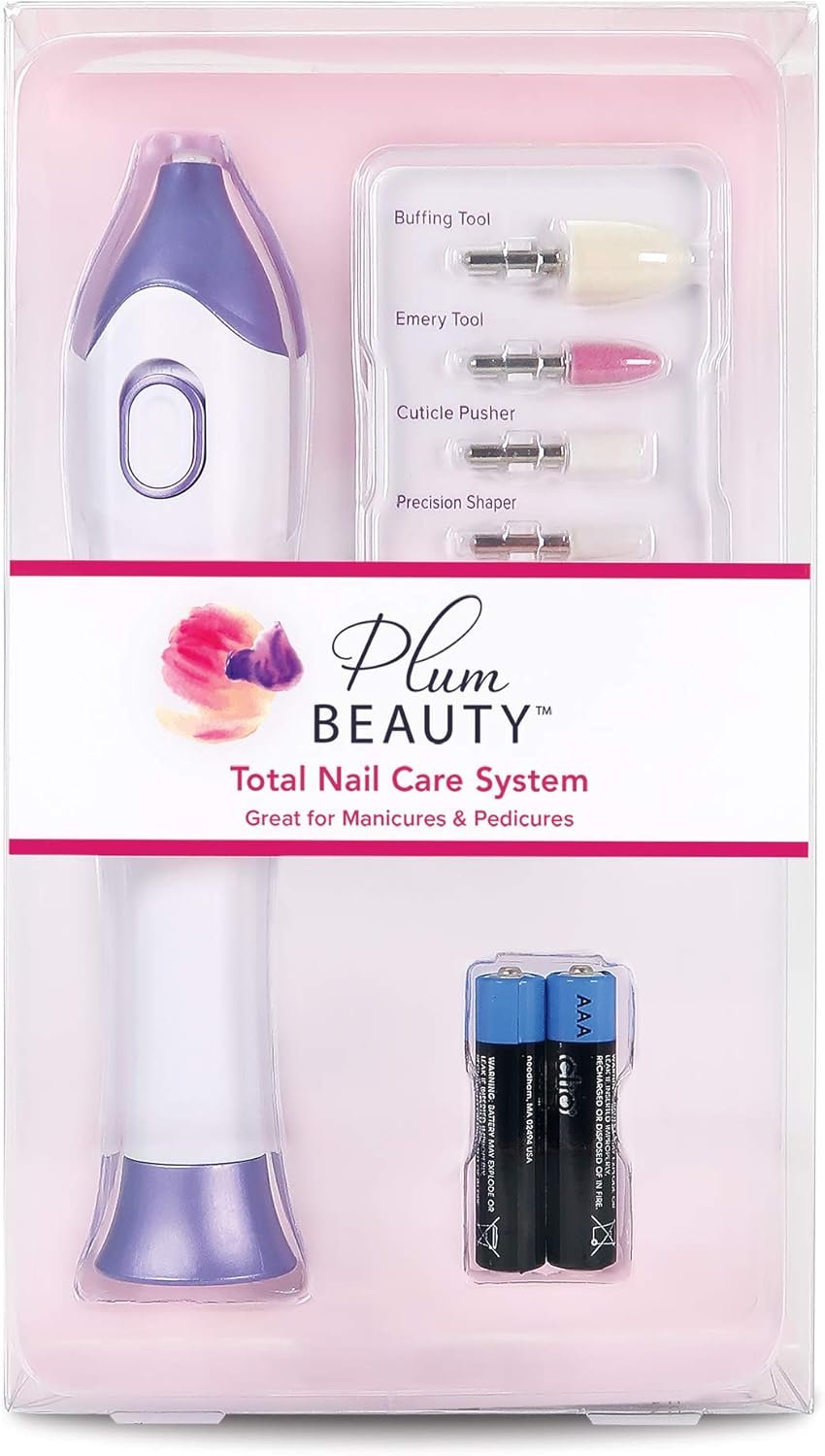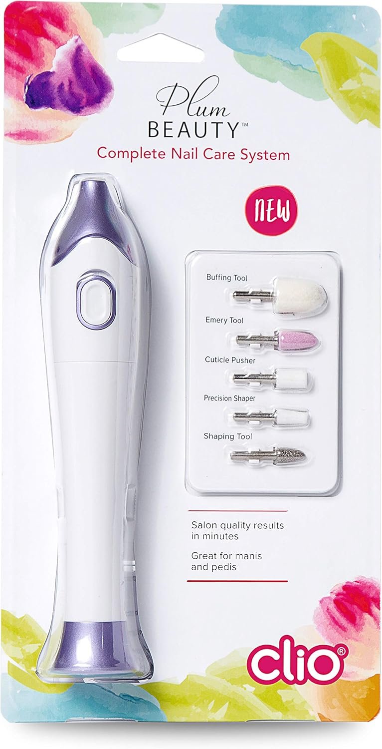 The Clio Plum Beauty Complete Nail Care System will save you a trip to the nail salon! It’s effective, easy to use and efficient in helping you save time on manicures and pedicures at home. This great little tool is an “all in one” solution with 5 interchangeable attachments: shaping tool, precision shaper, cuticle pusher, buffing tool and emery tool. The sleek, compact design makes it easy to fit in your make up or travel bag. Free batteries included..