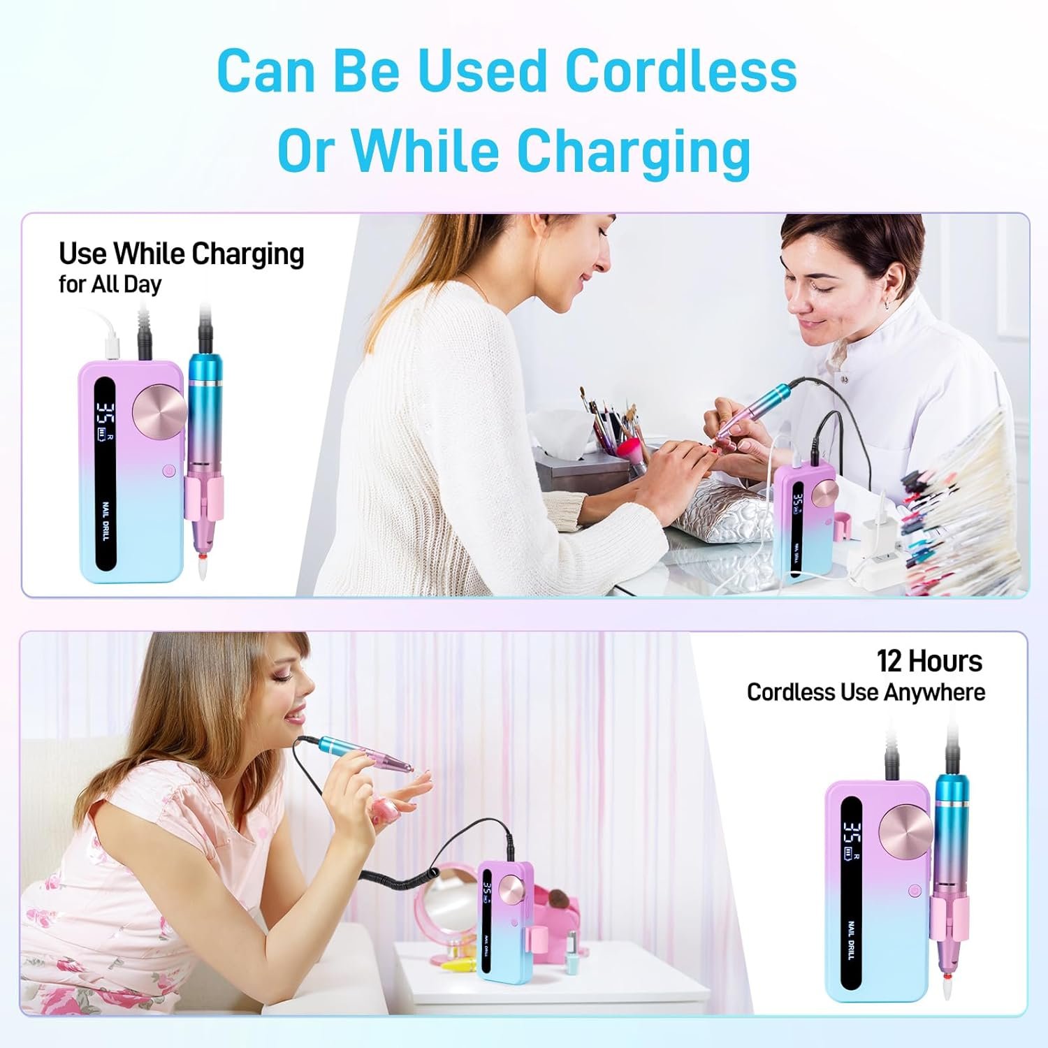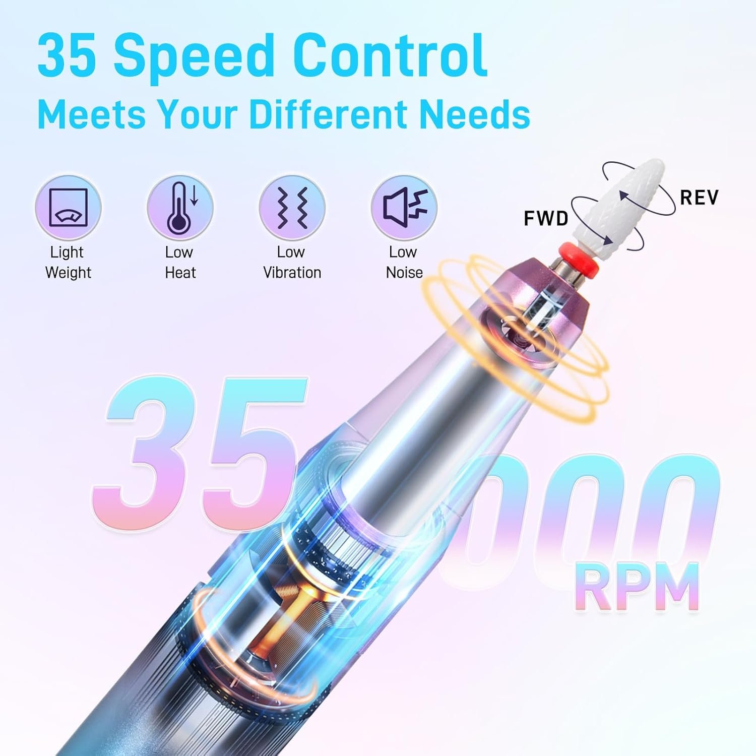 Powerful Performance: Equipped with a high-precision motor, this electric nail drill offers adjustable speeds up to 35,000 RPM, giving you complete control for all your nail care needs. Whether for professional salons or DIY at-home manicures, achieve smooth and detailed results every time.