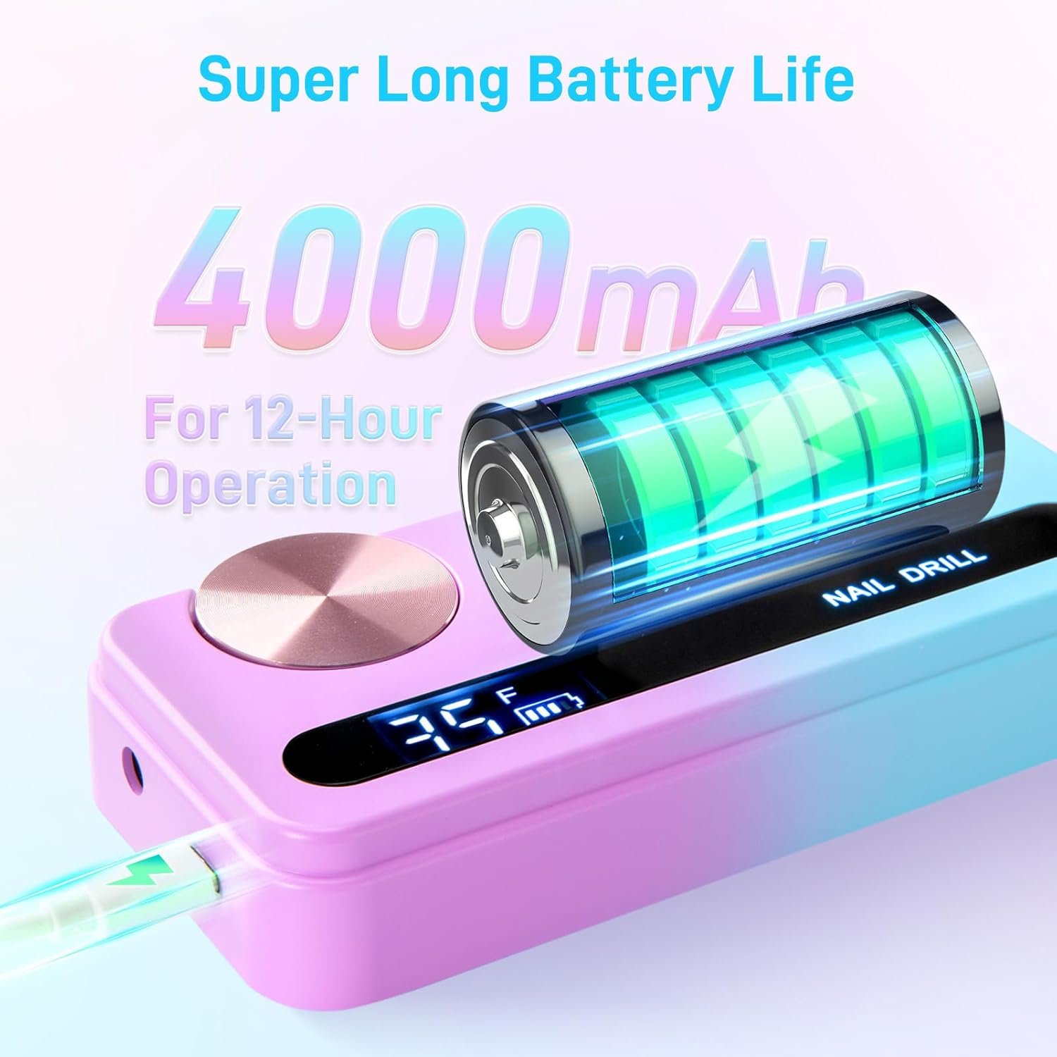 Long-Lasting Battery: Featuring a robust 4000mAh battery, this cordless nail drill fully charges in just 4 hours and provides up to 12 hours of continuous use. Compact and portable, it’s ideal for both professional and personal use anywhere you go.
