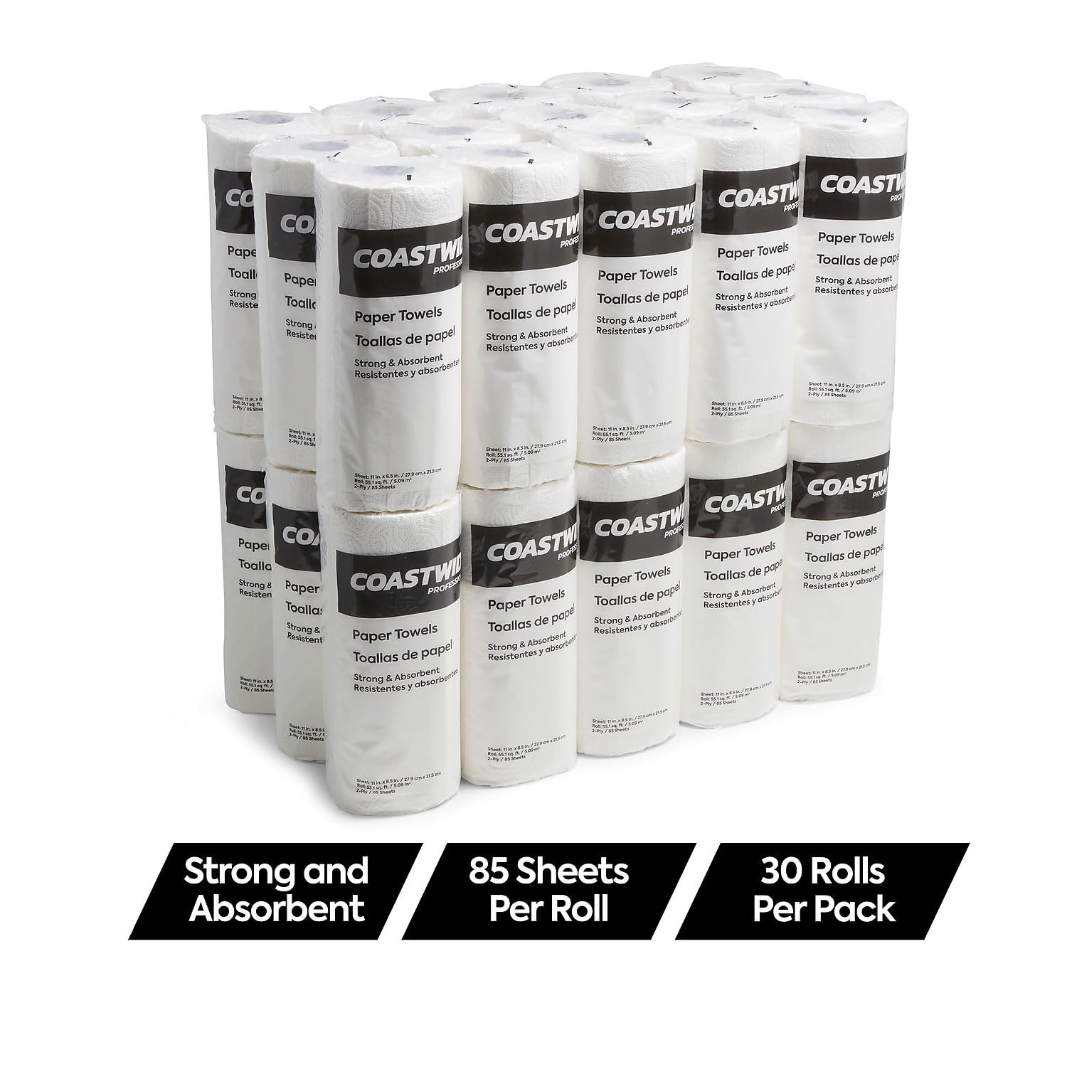 Product dimensions and units per carton: The Coastwide Professional two-ply kitchen paper towel rolls come in 30 individually wrapped paper towel rolls per carton. 85 sheets per roll and 2,550 sheets per carton.