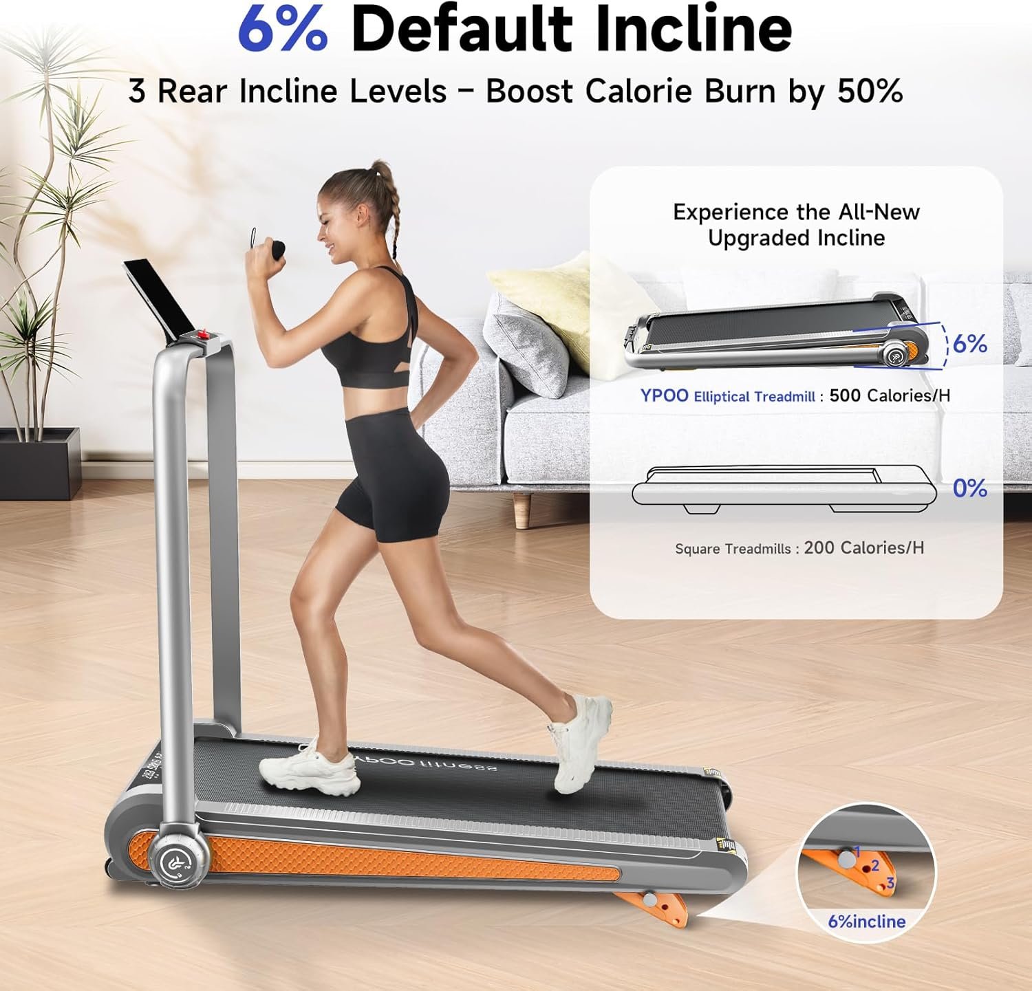 【3-Level Incline Treadmill with 6% Pre-Set Incline】:Experience a built-in 6% incline plus 3 adjustable levels for personalized workouts. This walking treadmill enhances exercise intensity and helps burn up to 50% more calories compared to standard walking pads. Its ergonomic design provides a knee-friendly, comfortable workout, making it perfect for home use. Whether you’re aiming for a light stroll or a more challenging incline, this treadmill adapts to your fitness goals.