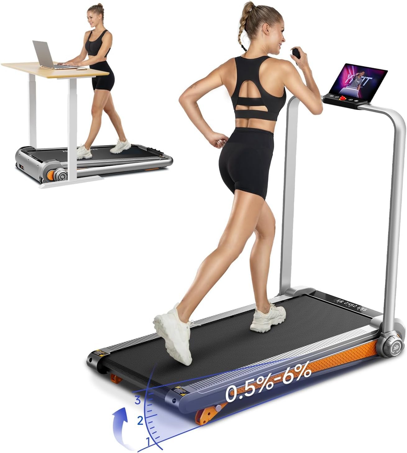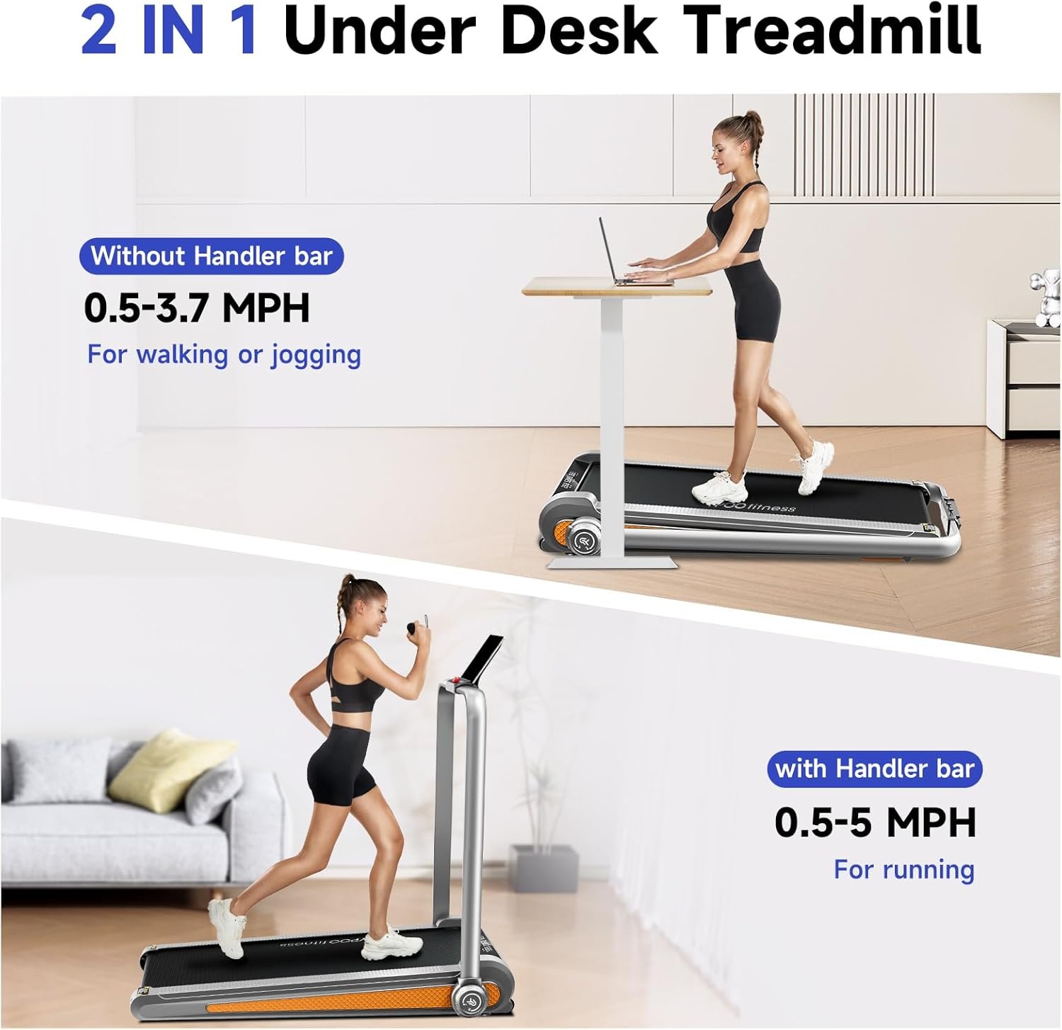 【2-in-1 Under Desk Treadmill】:The YPOO walking pad with handle bar features a powerful 2.5 HP low-noise motor, supporting users up to 300 pounds.This foldable treadmill easily transforms into a sleek walking pad for leisurely strolls at speeds of 0.8-6.0 KM/H (0.5-3.7 MPH).Raise the handle bar to elevate your workout intensity, allowing for vigorous runs at speeds of up to 8.0 KM/H (5.0 MPH).