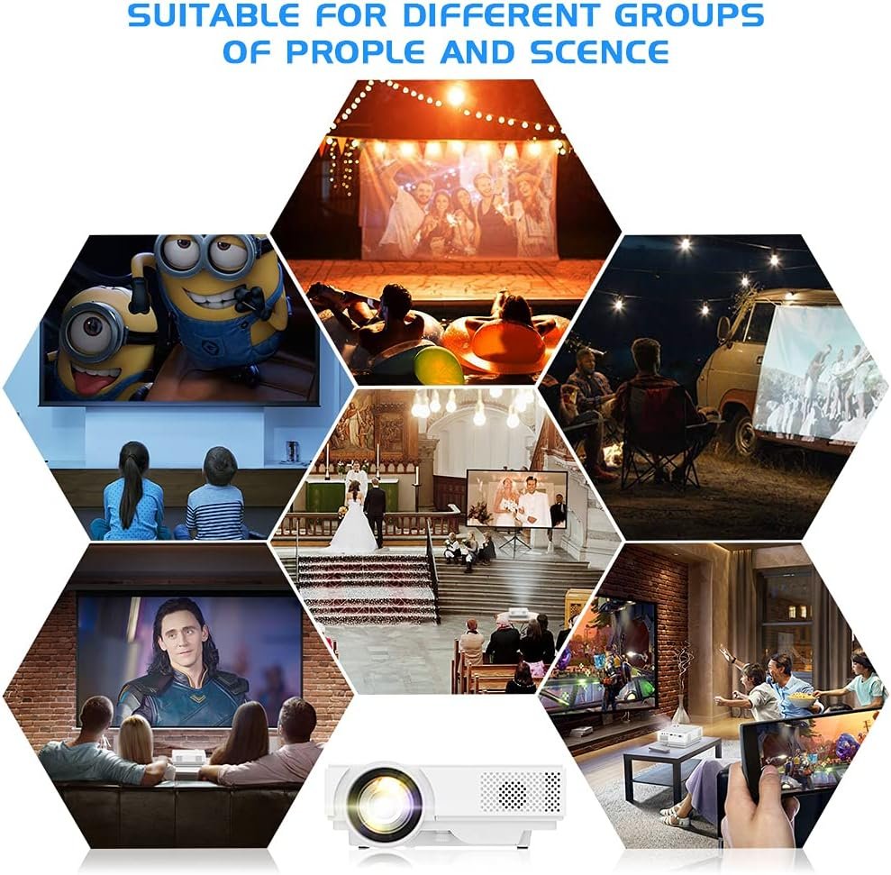 [Meet Your Home Needs] Watch movies, take online classes, or keep the kids entertained with hours of cartoons and educational videos [ideal for use in low-light environments]. It’s the innovation of traditional projector, built-in stereo speakers, adjust keystone and focus to get 32’’ 176’’ projection size with 1.5m-5m projection distance, bring excellent spectating experience. Perfect projector for outdoor movies and movie projector for indoor use.