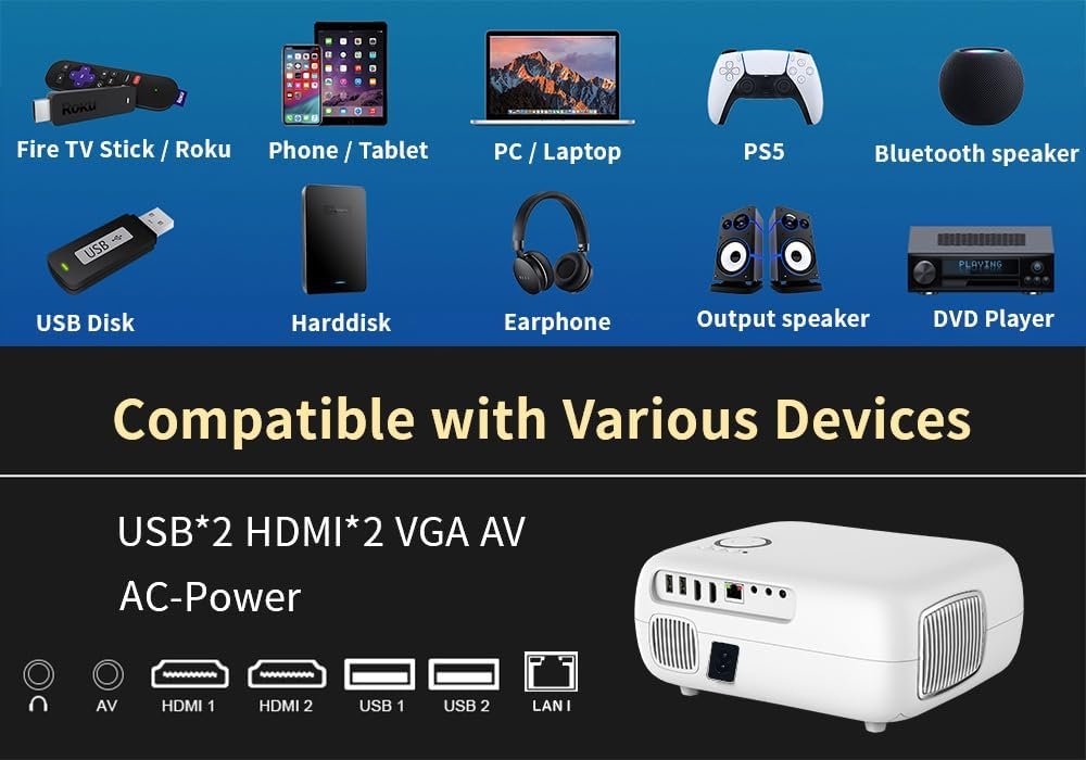 【Portability & Wide Compatibility】With HDMI/USB/AV/Audio ports, our WiFi projector is compatible with the iPhone, Android smartphone, Laptop, tablet, TV Stick, external speaker, PS5, USB disk, and more. With just a plug-and-play, let’s start the endless entertainment at your garden parties, backyard gatherings, outdoor camping, and more. This outdoor projector has a compact design and comes with a 100″ screen, which can easily fit in backpacks for easy portability on the go.