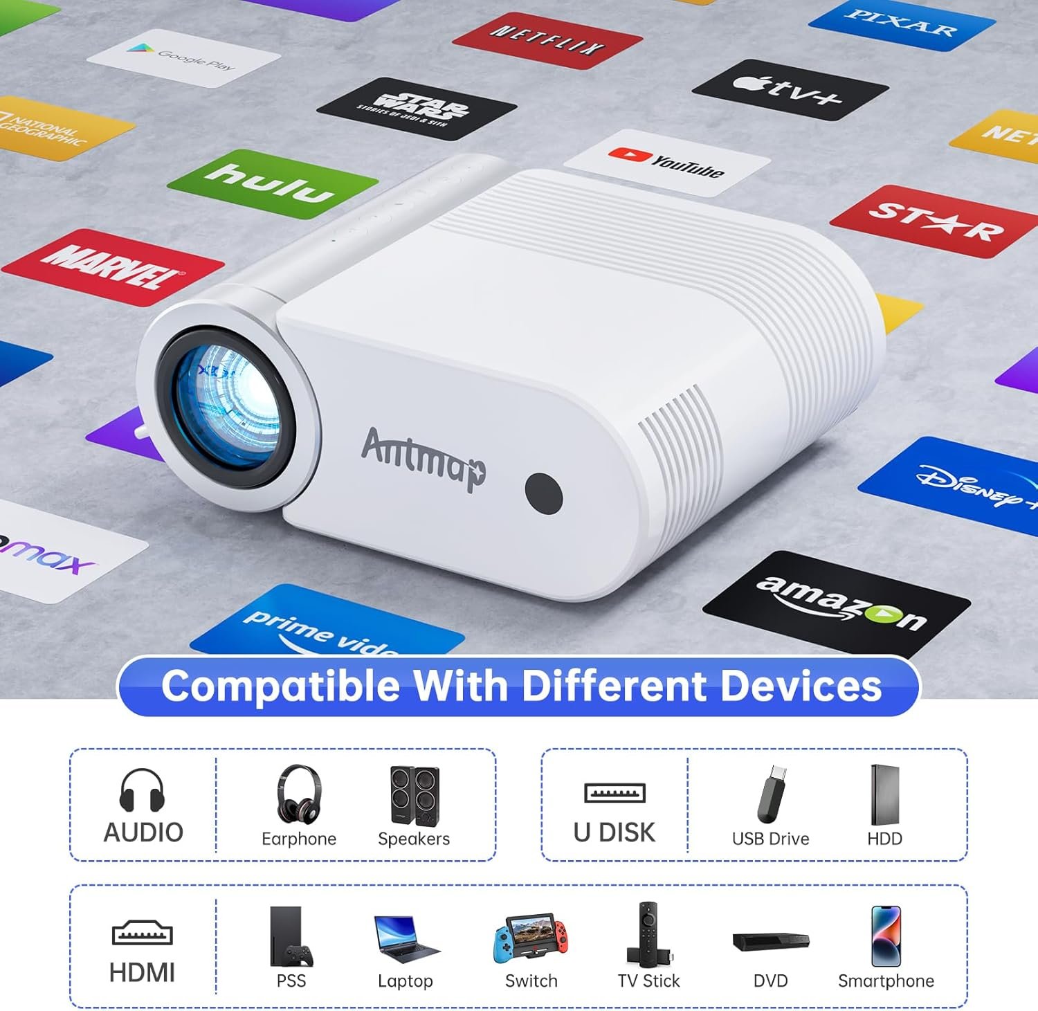 【Multimedia Compatibility】This 1080p projector equips with a USB & HDMI Port, a micro USB port, an earphone port and a power input port. It is compatible with Amazon fire TV stick, USB, DVD player, laptop, MacBook, iOS/Android phone/tablets, headphone, external speakers, PS4 etc.