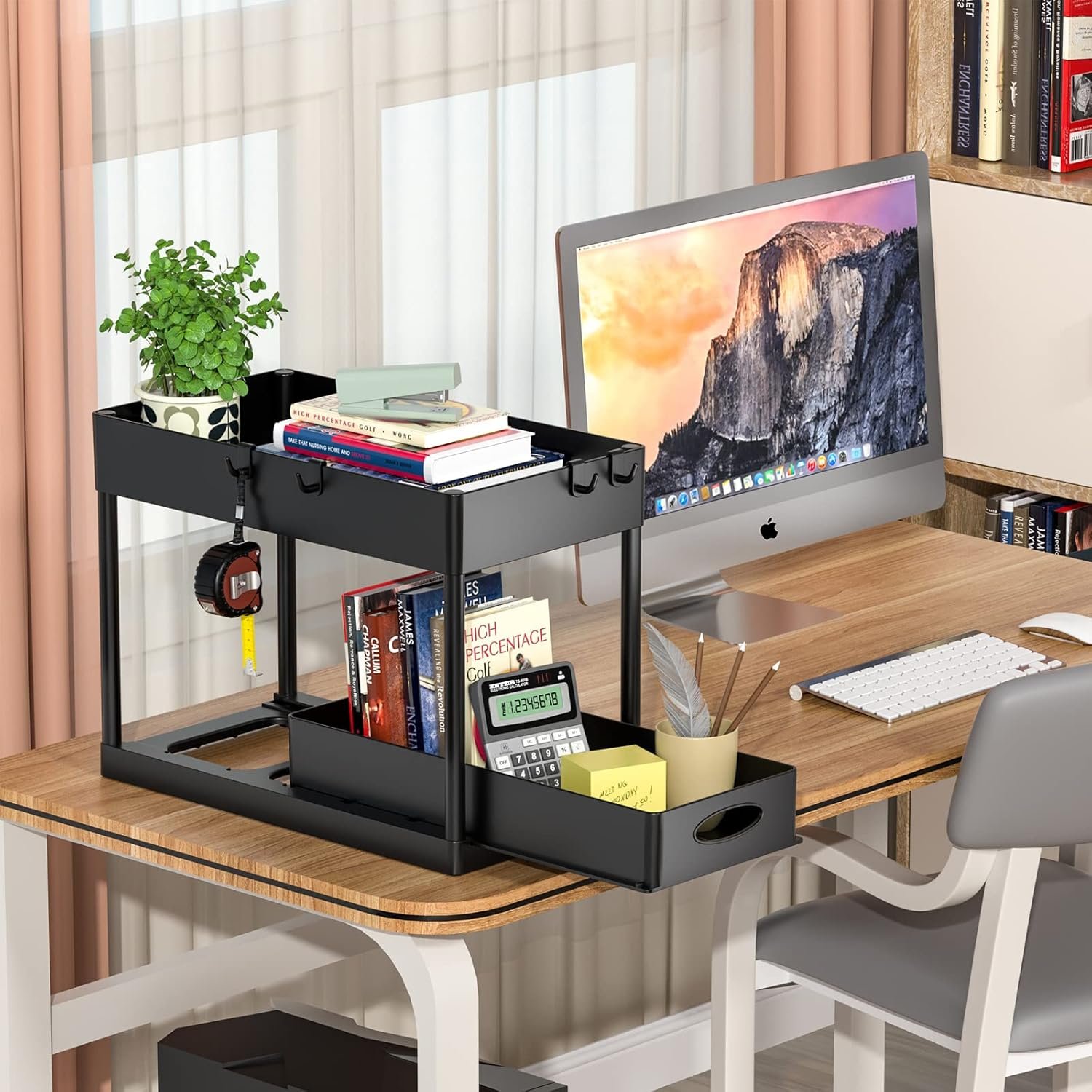 👍 Sliding Storage Drawers: Very compact under sink organizers and storage in two levels maximizes vertical space. The bottom sliding drawers can be pulled out by the handles for easy access to items behind the front row. There are 8 little hooks to hang stuff off the unit, effectively using the entire space of the cabinet