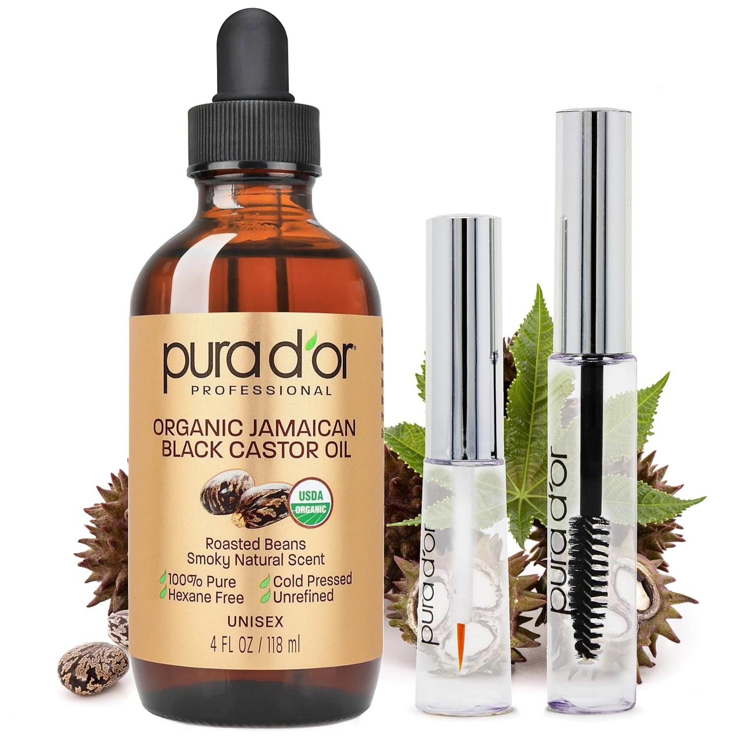 PURA D’OR 4 Oz ORGANIC Jamaican Black Castor Oil – Natural Smoky Scent – w/ 2 BONUS Empty Brushes – 100% Pure USDA Certified Cold Pressed & Roasted, Hexane Free Eyelash & Eyebrow Serum
