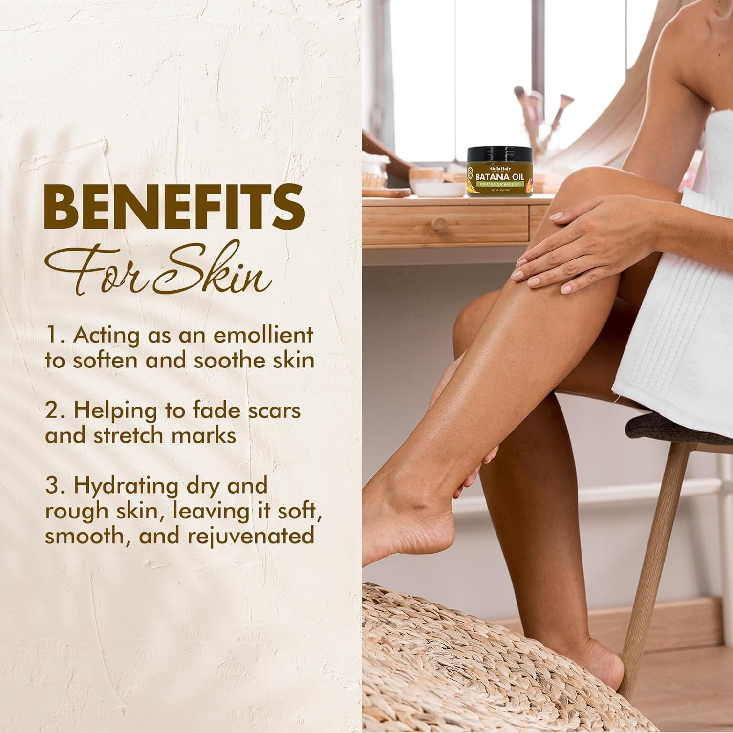 Skin moisturizer: Batana oil deeply conditions and moisturizes the skin, making it particularly beneficial for dry skin types. The fatty acid composition of batana oil helps combat signs of aging, helping to reduce the appearance of fine lines and wrinkles.