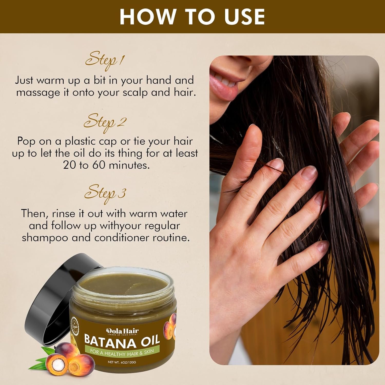 Pre Shampoo Treatment-The night before your wash day, massage your Batana Oil product into your scalp and strands. Cover your hair with a plastic conditioning bag. Then, tie a scarf around your head to keep the plastic bag in place as you sleep through the night. Within 24 hours, proceed with your regular wash day routine.Rinse Out Conditioner-After washing your hair, massage a small amount of pure Batana Oil (or a generous amount conditioner containing Batana Oil) to your hair and scalp. Especially pay attention to the scalp, making sure the conditioner is massaged directly into the scalp. After 3-5 minutes, rinse hair. Do this each time you wash your hair.Moisturizer-Mix a about one tablespoon of Batana Oil into your regular daily moisturizer; or find a moisturizing product containing Batana Oil like our Royal Restoration Cream (link at the end of this post). Spray hair with plain water or a water-based liquid hair product to dampen hair. Then, massage the Batana moisturizer into your hair and scalp. Do this 1-2 times a week or anytime hair feels dry.