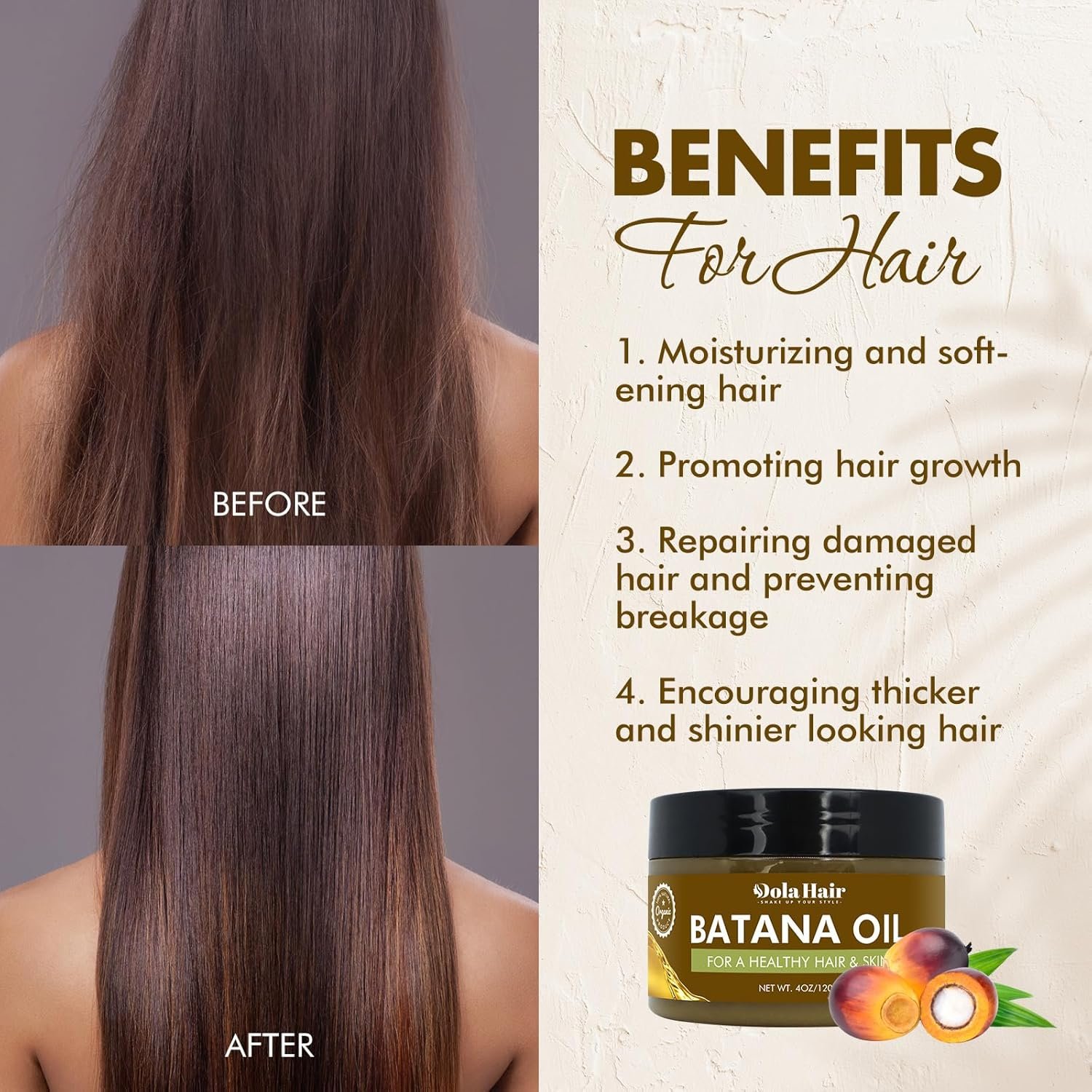Hair Growth and Nourishment: The vitamins and essential fatty acids in Batana oil can nourish the scalp, leading to improved hair growth, while also helping to repair damage and prevent breakage. Batana oil is also effective in moisturizing and softening hair, making it more manageable with a brilliant shine.