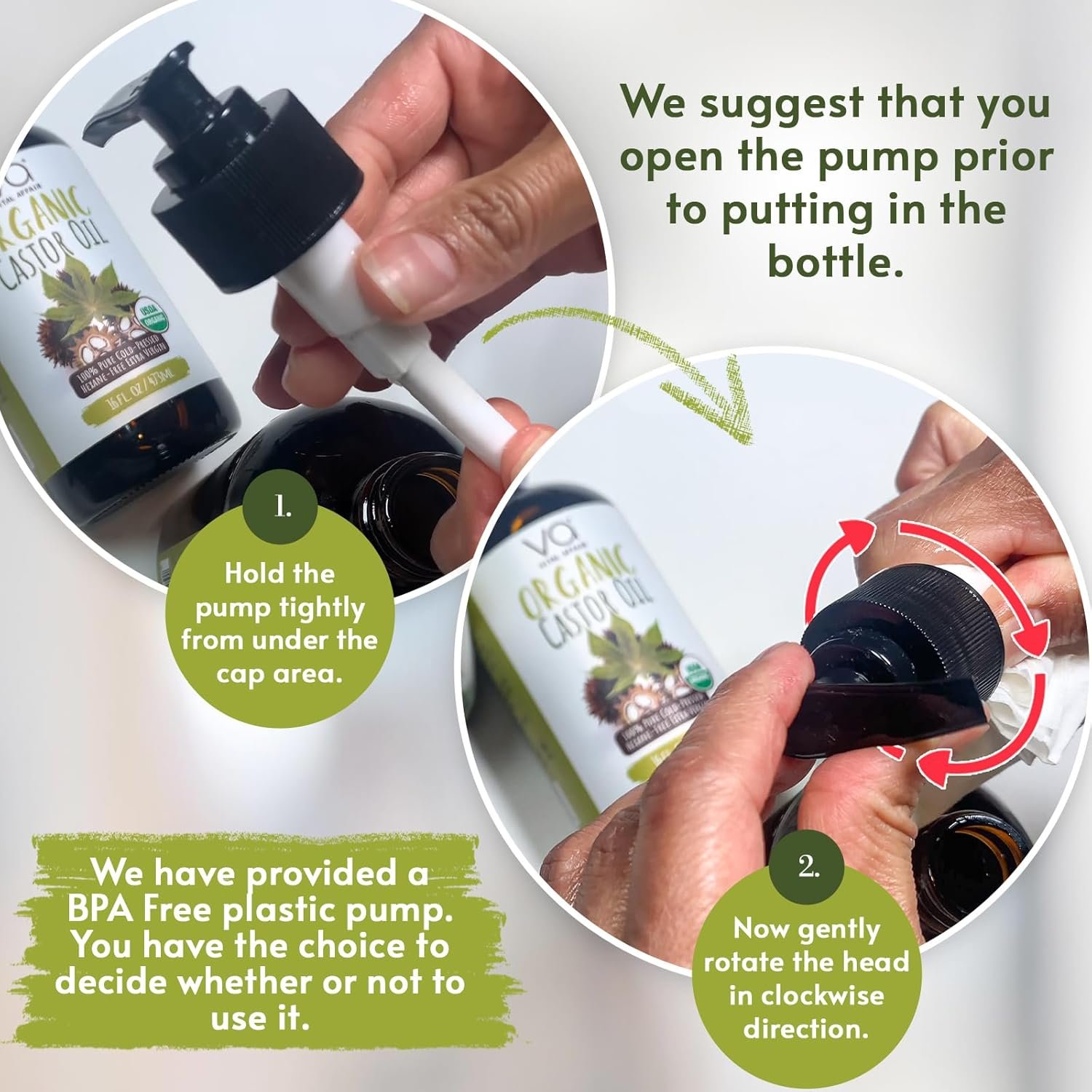 EXPERIENCE THE AMAZING BENEFITS OF CASTOR OIL, PRESERVED IN A GLASS BOTTLE WITH A BPA FREE PUMP FOR MESS FREE POURING.