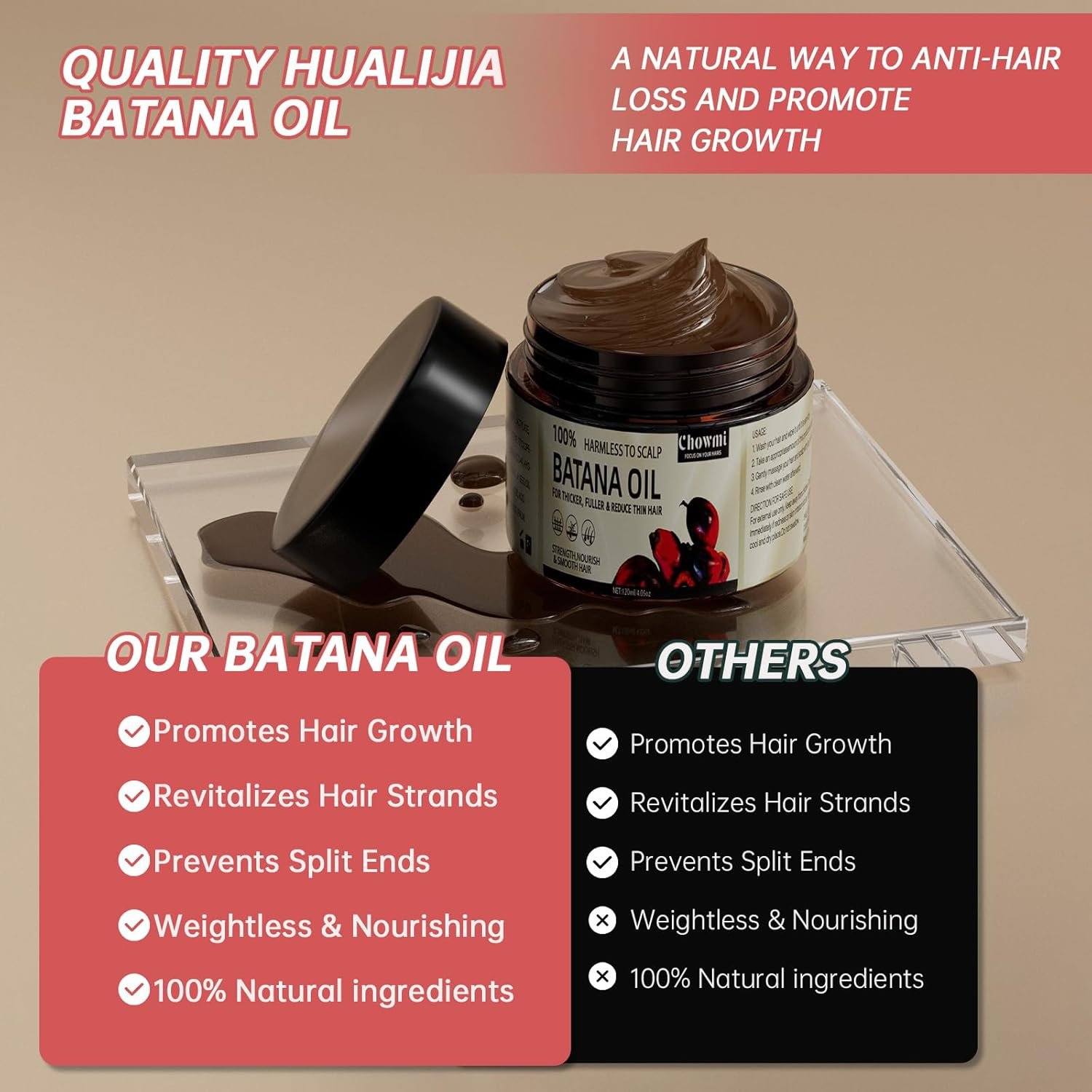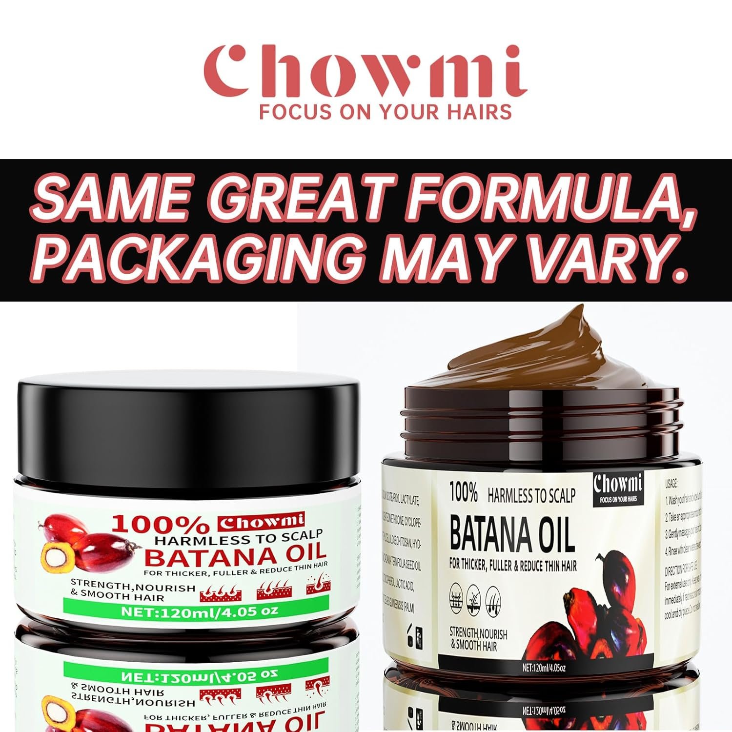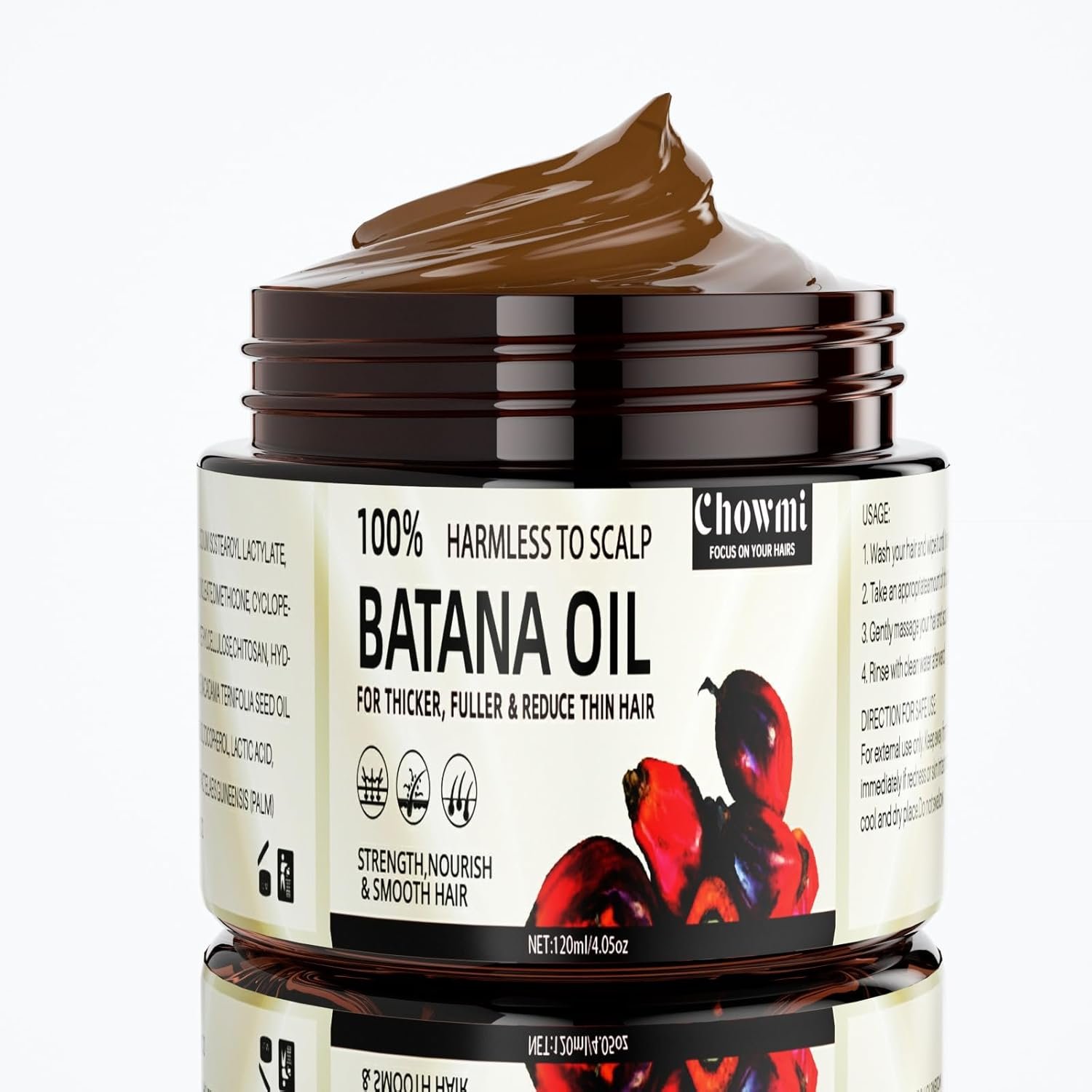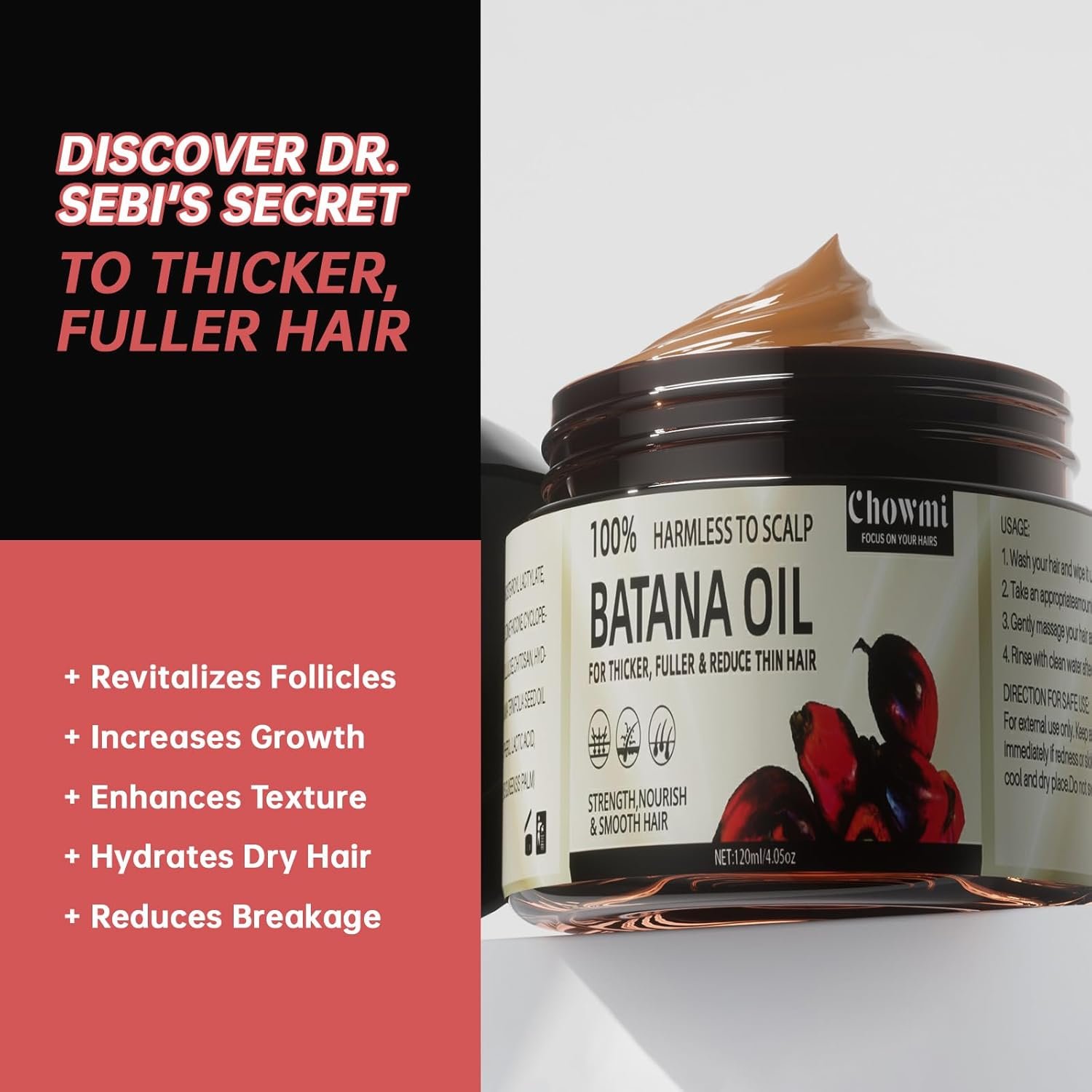 Organic and Natural Ingredients: Our batana oil is made from 100% organic and natural ingredients, free from any chemicals or additives. Enjoy pure, wholesome care for your hair without any harsh substances.