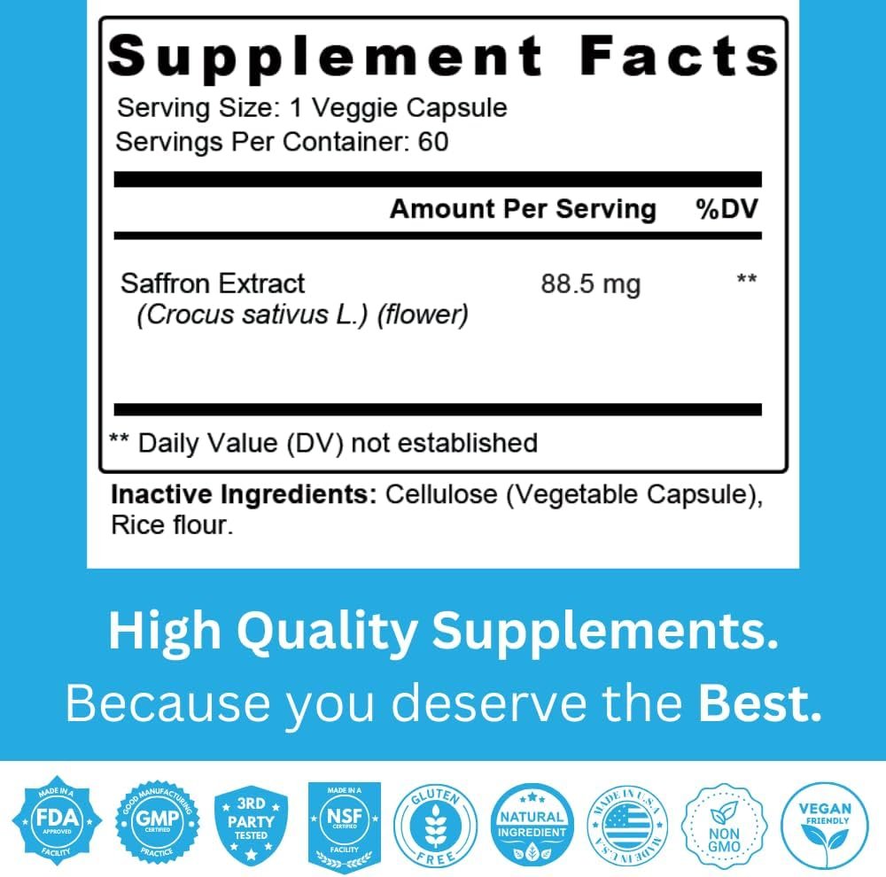 Clean and Simple Ingredients: Our saffron supplement is made without unwanted additives. It contains no artificial colors, flavors, preservatives, or common allergens like gluten, dairy, or soy. Produced with care, it meets high manufacturing standards and undergoes rigorous testing.