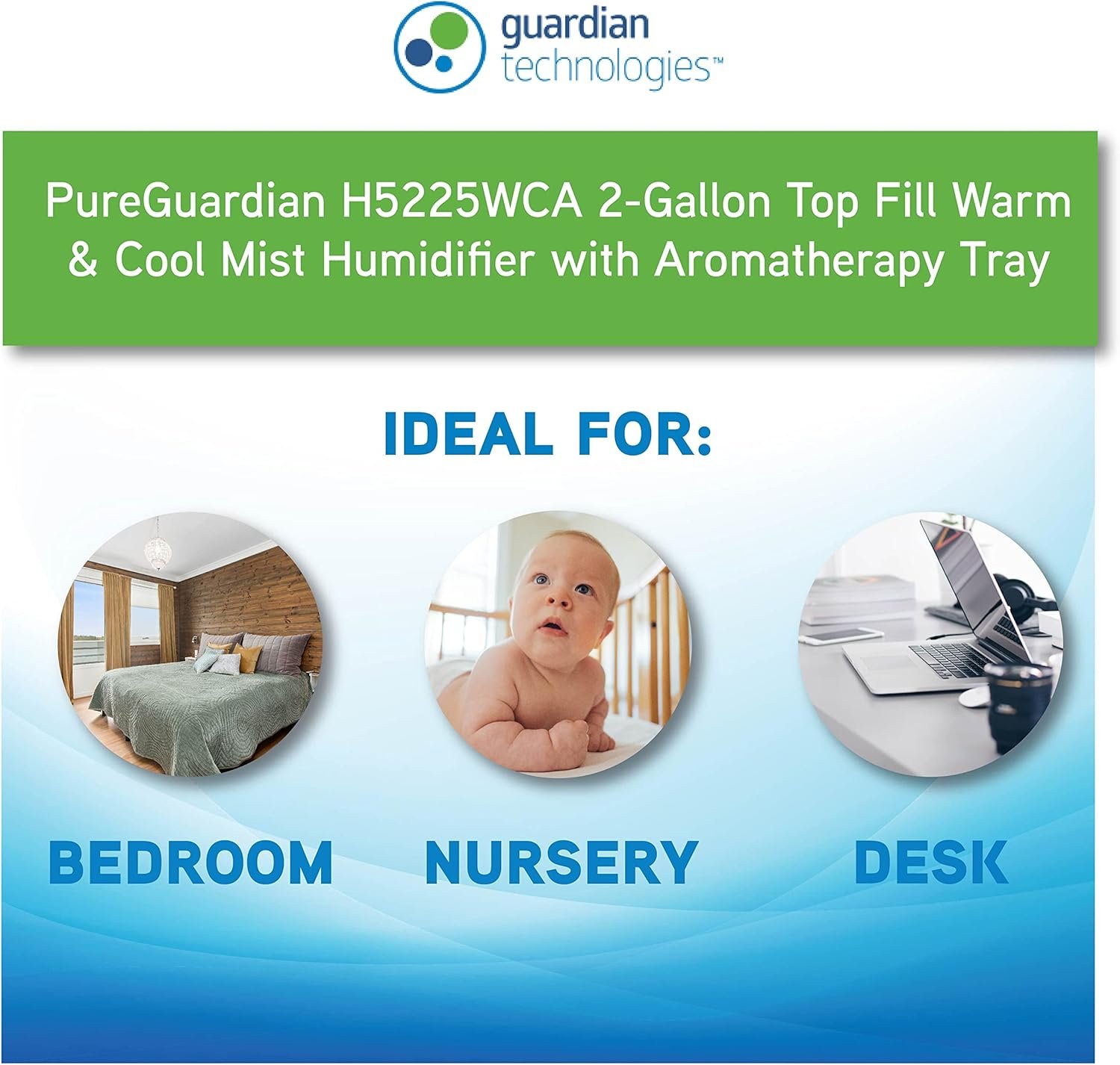 WARM & COOL MIST HUMIDIFIER: The PureGuardian H5225WCA ultrasonic cool mist humidifier guards against dry air in the home, perfect for those with colds, allergies and dry skin. The easy fill 2 gallon tank covers 560 sq. ft. rooms and runs up to 100 hours