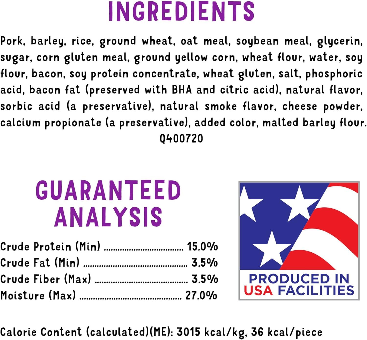 Real meat is the first ingredient in these chewy snacks for dogs made with real bacon and no added artificial flavors or FD and C colors