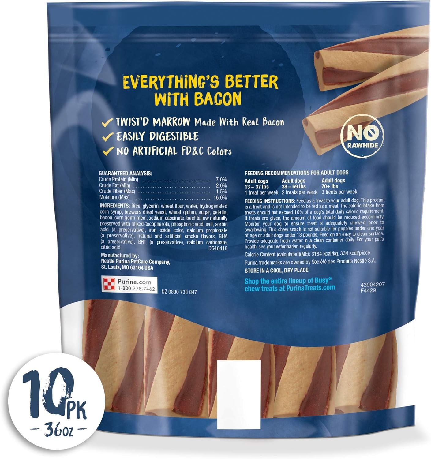 Watch the hilarious antics that happen when you give your dog a Purina Busy With Beggin’ Twist’d Small/Medium adult dog treat. The mix of savory Beggin’ bacon flavor along with the long-lasting Busy chew gives your dog double the fun in one dog treat, with a chewing experience that helps clean teeth. The tasty spiral of yum in this dog treat helps feed his natural instinct to chew, giving him some busy work when you can’t give him your full attention. These easily digestible treats are made without artificial FD and C colors, and we perform regular checks on our products throughout the manufacturing process, so you can feel good about serving a dog treat to your small or medium-sized dog. Made without rawhide, this dog treat is ideal for adult dogs over 24 pounds. Feed this Purina Busy With Beggin’ Twist’d Small/Medium dog treat in addition to his well-balanced daily diet and with your vet’s recommendations according to his weight, and watch the fun unroll with every twist and turn.